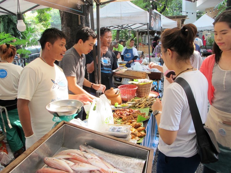 แน่นอนว่างานครั้งนี้ก็มีตลาดเปิดภายใต้แนวคิด Clean Green Fair ที่เราสามารถแวะไปช้อปและชิมอาหารทะเลสดใหม่กันได้เต็มที่ ไม่ว่าจะเป็นกุ้ง หอย ปู ปลา ก็ล้วนแล้วแต่มาจากแหล่งประมงชั้นเลิศของพี่น้องชาวประมงในประเทศไทย อาทิ จ.ประจวบคีรีขันธ์ จ.นครศรีธรรมราช จ.สตูล ทะเลสาบสงขลา และจ.ตราด เป็นต้น