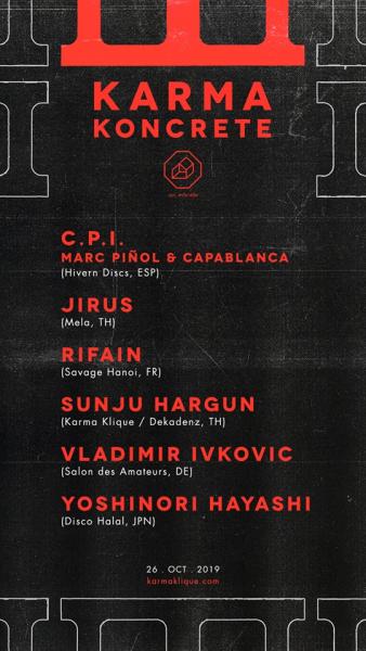 Karma Koncrete คือปาร์ตี้ที่ฉีกแนวทางเดิม ๆ จากการเรียกตัวเองว่าเป็น 'คอนเสิร์ต' ไปสู่อีกระดับของงานดนตรีที่จะพานักฟังเพลงชาวไทยทั้งหลายดำดิ่งสู่แนวเพลงที่ไม่คุ้นหูจากลิสต์ดีเจระดับท็อปจากทั่วโลก อาทิ CPI จากสเปน, Rifain จากฝรั่งเศส, Vladimir Ivkovic จากเยอรมนี, Yoshinori Hayashi (ญี่ปุ่น) และร่วมกับทีมแก๊งดีเจจากไทยอย่าง Sunju Hargun และ Jirus ส่วนแนวเพลงก็จะหลากหลายตามสไตล์ของดีเจแต่ละคน ทั้ง EDM, House, Techno และแนวเพลงที่ไม่คุ้นหูอีกเพียบเพื่อเปิดโสตประสาทเราให้ดำดิ่งไปกับประสบการณ์ใหม่ ๆ