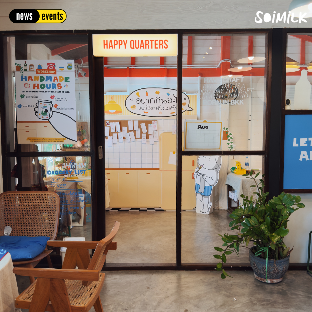 นี่คงเป็นคอนเซปต์ของ ป้อ–ชัยวัฒน์ อุทัยกรณ์ และ ตาล–วริษฐา จงสวัสดิ์ ศิลปินเบื้องหลังน้องลายการ์ตูน Ease Around ที่มาจับมือกับ Happy Mum Happy Me คาเฟ่ในบ้านคุณแม่โซนนวมินทร์ (ที่เราเองก็เป็นแฟนคลับตามคุณแม่มาสักพักใหญ่ๆ) อยากให้คนทำงาน ได้มาปล่อยจอยจากความเครียดทำงานดูบ้าง โปรเจคคอลแลบครั้งนี้ เลยเปลี่ยนพื้นที่ด้านบนของตัวคาเฟ่ ให้กลายเป็นพื้นที่ฮีลใจขนาดย่อมๆ ให้เราได้มาเวิร์กช็อปทำแก้ว ทำกระติกน้ำ พร้อมติดลายสติกเกอร์ของอีสตามแบบฉบับของตัวเอง
