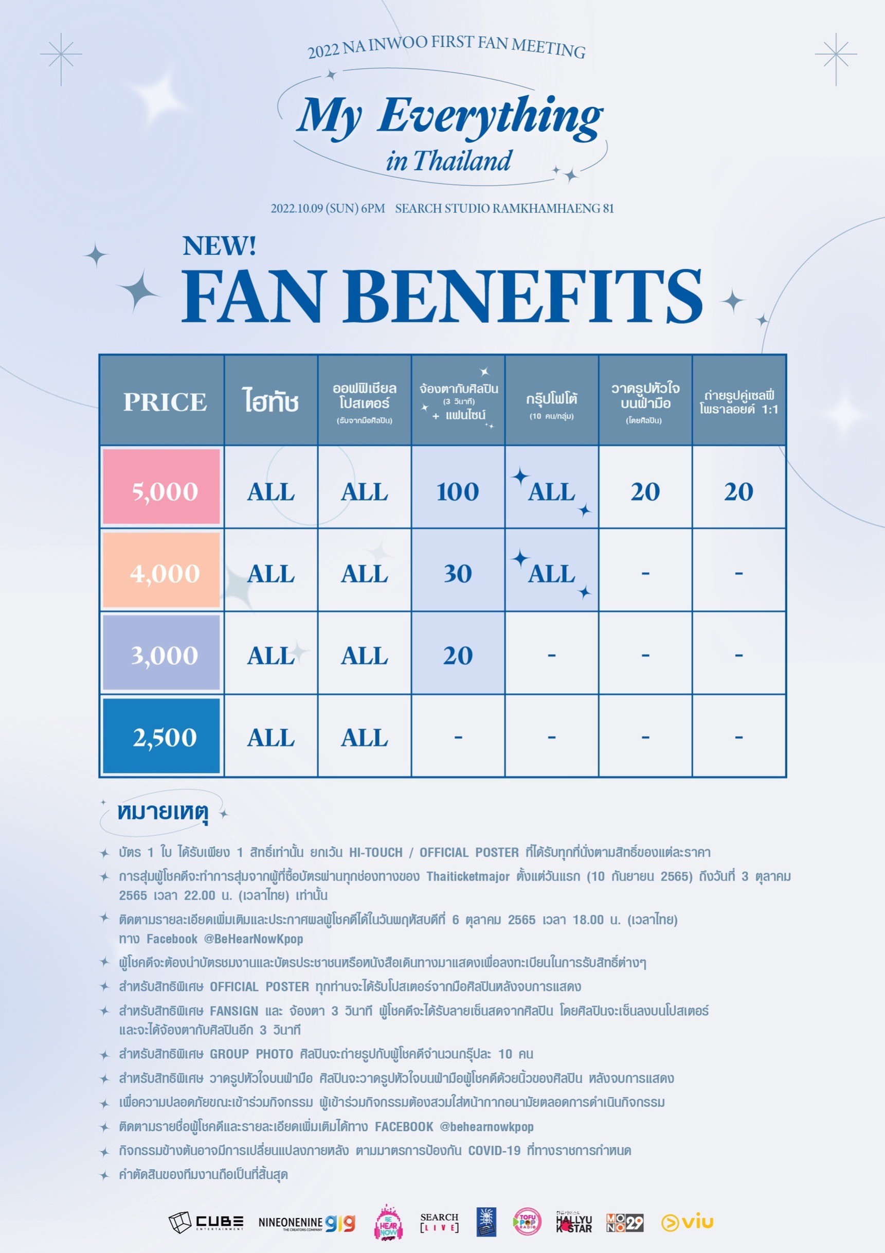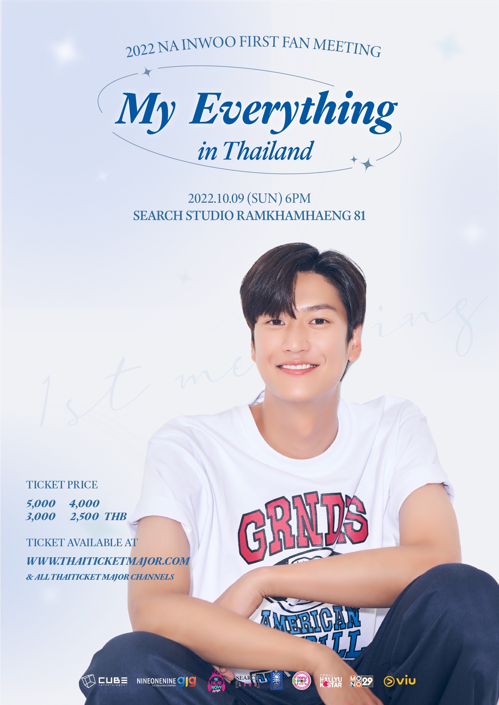 2022 NA INWOO 1st FAN MEETING MY EVERYTHING IN THAILAND จัดวันอาทิตย์ที่ 9 ต.ค. เวลา 18:00 น. ที่ Search Studio ซ.รามคำแหง 81 บัตรราคา 5,000 / 4,000 / 3,000 และ 2,500 บาท ซื้อบัตรได้ทาง thaiticketmajor.com