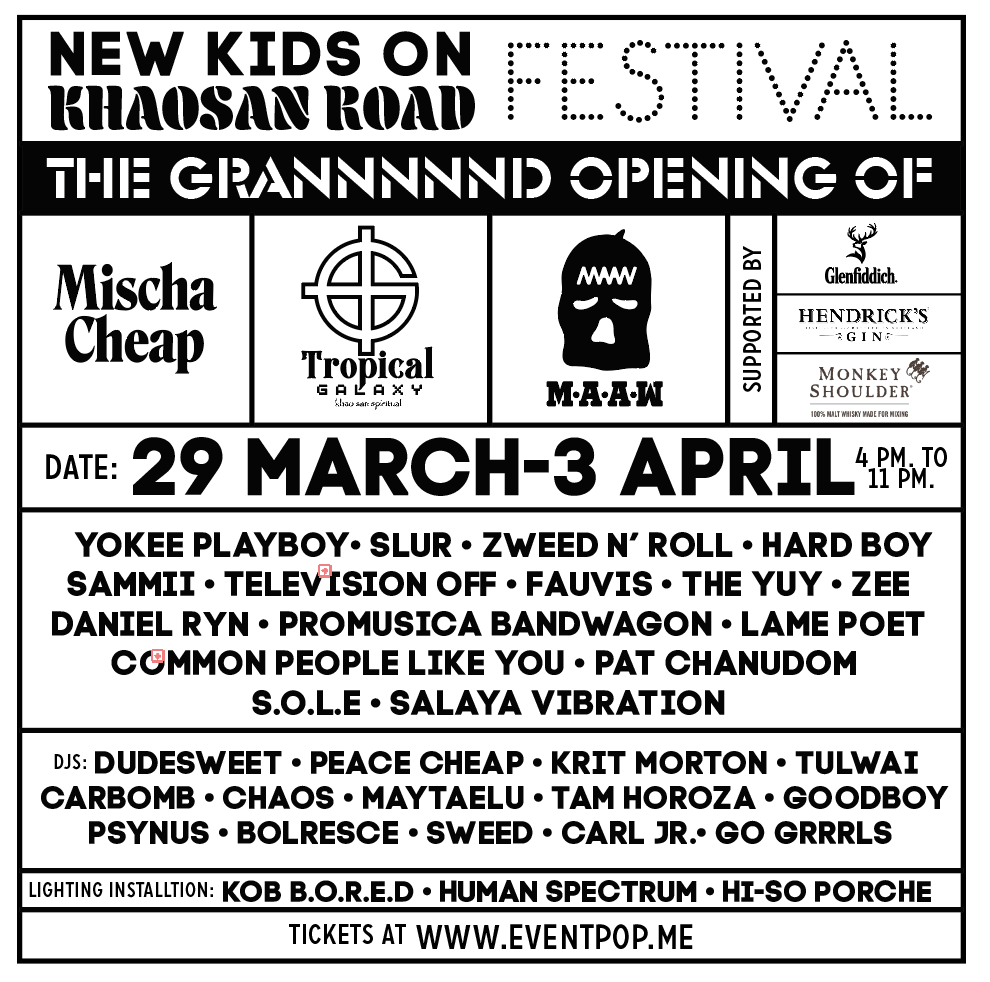 เป็นการเปิดตัวร้านที่ไม่มีอะไรจะแกรนด์ได้เท่านี้อีกแล้ว เพราะนี่คืองานเฟสติวัลดนตรี พ่วงปาร์ตี้แกรนด์โอเพนนิ่งจากบาร์น้องใหม่ (แต่เก๋า) แห่งข้าวสารโร้ดอย่างร้าน Mischa Cheap ที่เพิ่งย้ายบ้านมาจากฝั่งอารีย์หลังปิดร้านไปนานเป็นปี ๆ ซึ่งพอย้ายปุ๊บ ก็สั่นสะเทือนถนนข้าวสาวด้วยการจัดงาน New Kids On Khaosan Road Festival ที่จะมีต่อเนื่องตั้งแต่วันนี้ - 3 เม.ย. แบบ 6 วันรวด ไม่ต้องพักต้องผ่อนกันไปเล้ย