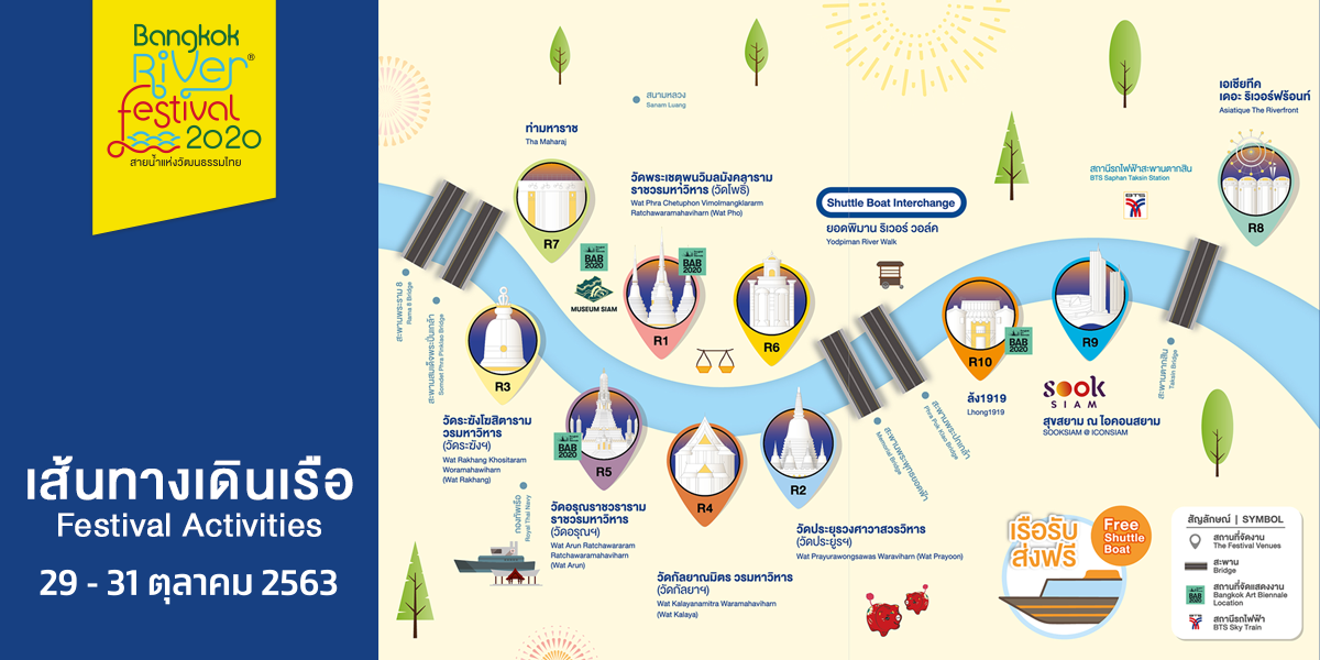 Boat (วันที่ 29 - 31 ต.ค. 2563) - ชิลล์ไปกับบรรยากาศดี ๆ ล่องเรือฟรีตลอดทั้งงาน ผ่าน 10 ท่าน้ำร่วมสมัย ได้แก่ วัดโพธิ์, วัดอรุณฯ, วัดระฆังฯ, วัดกัลยาฯ, วัดประยูรฯ, ท่ามหาราช, ยอดพิมาน ริเวอร์ วอล์ก, ล้ง1919, สุขสยาม ณ ไอคอนสยาม และเอเชียทีค เดอะ ริเวอร์ฟร้อนท์ เวลา 17:00 - 22:30 น.