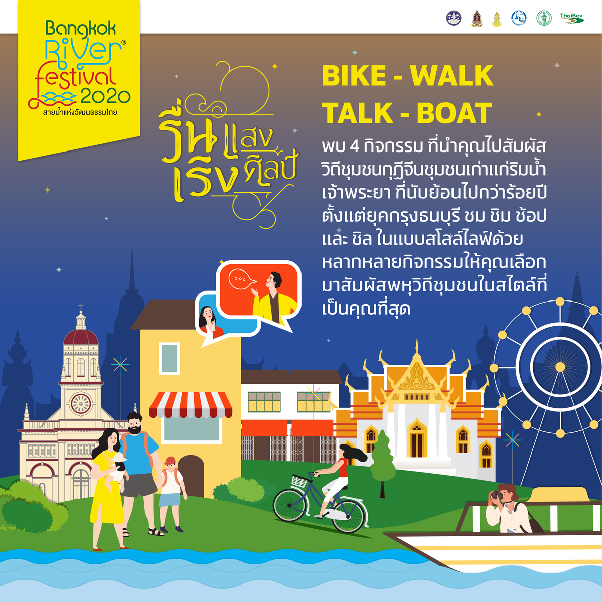 ในปีนี้งาน Bangkok River Festival ได้กลับมาในคอนเซปต์ "รื่นแสง เริงศิลป์" พร้อมกับ 4 กิจกรรมไฮไลต์ ที่จะทำให้ทุกคนได้ไปสัมผัสวิถีวัฒนธรรมชุมชน ผ่านการ Bike, Walk, Talk และ Boat ขอบอกเลยว่านอกจากจะได้ชิลล์ไปกับบรรยากาศและความสวยงามของแต่ละชุมชนแล้ว ยังได้ความรู้ติดตัวกลับมาด้วยอีก