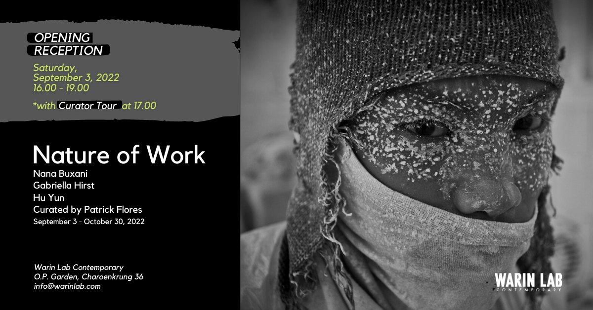 นิทรรศการ Nature of Work ของ นานา บูซานี, แกเบรียลลา เฮิร์สต์ และ ฮู ยุน โดยคิวเรเตอร์ แพทริก ฟลอเรส งานนี้ เป็นการแกะรอยการทำงานในสถานการณ์ต่าง ๆ ที่มีทั้งความหยาบกระด้างและความละเอียดอ่อน สะท้อนให้เห็นระบบนิเวศด้านแรงงาน ตลอดจนความเชื่อมโยงของแรงงานมนุษย์ พลังธรรมชาติ และความทรงจำทางประวัติศาสตร์ เริ่มจากการแกะรอยสถานการณ์ที่เคยเกิดขึ้น ที่นำไปสู่การเปลี่ยนแปลงต่อธรรมชาติ และปิดที่สำรวจผลที่ตามมาทั้งกับผู้รอดชีวิตและผู้สูญหาย
