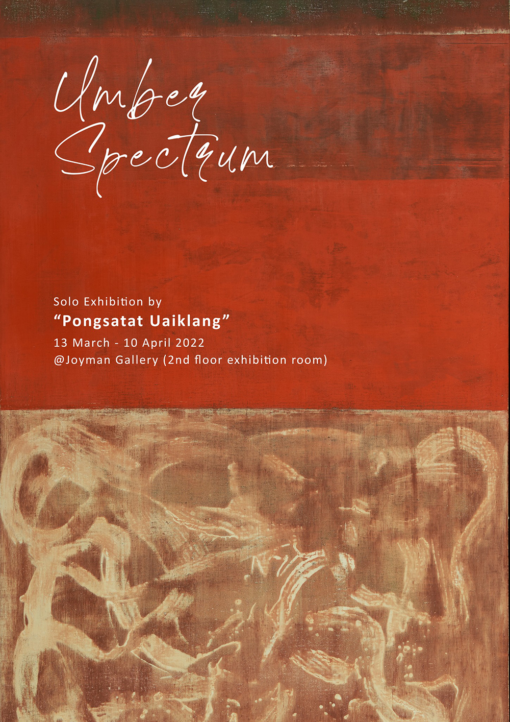ในนิทรรศการ Umber Spectrum ศิลปินนำดินดงพญาไฟมาใช้ผลิตเป็นสีฝุ่นและสร้างพื้นผิวในงานจิตรกรรม ด้วยชีวิตที่เติบโตขึ้นจากลูกชาวนาชาวไร่ในดงพญาไฟที่เป็นบ้านเกิด ดินที่นี่จึงเต็มไปด้วยความทรงจำแสนวิเศษ ร่างกายที่เคยคลุกตัวลงบนผืนดิน สูดกลิ่นฝน รับไอแดด ทุกหยาดเหงื่อของชีวิตชาวไร่ชาวนาบนดินแดนแห่งนี้คือสัมผัสในวัยเยาว์ที่สร้างร่องรอยชีวิต ร่องรอยนั้นฝังรากลึก ไม่ว่าจะผ่านร้อน ผ่านแล้ง ผ่านฝนกี่ฤดูกาล ศิลปินยังคงเป็นหนึ่งเดียวกับผืนดินแห่งนี้เสมอ การได้กลับบ้านที่ภาคอีสานคือการเติมเต็มพละกำลังทางกายและใจ ร่องรอยลงบนผืนดินสีน้ำตาลส้มที่ดงพญาไฟได้จุดประกายให้หัวใจศิลปินพองโต เปลวแดดที่ส่องแสงบนผืนดินดงพญาไฟนั้นยิ่งขับเน้นให้สีสันในผืนดินระยิบระยับเป็นประกาย