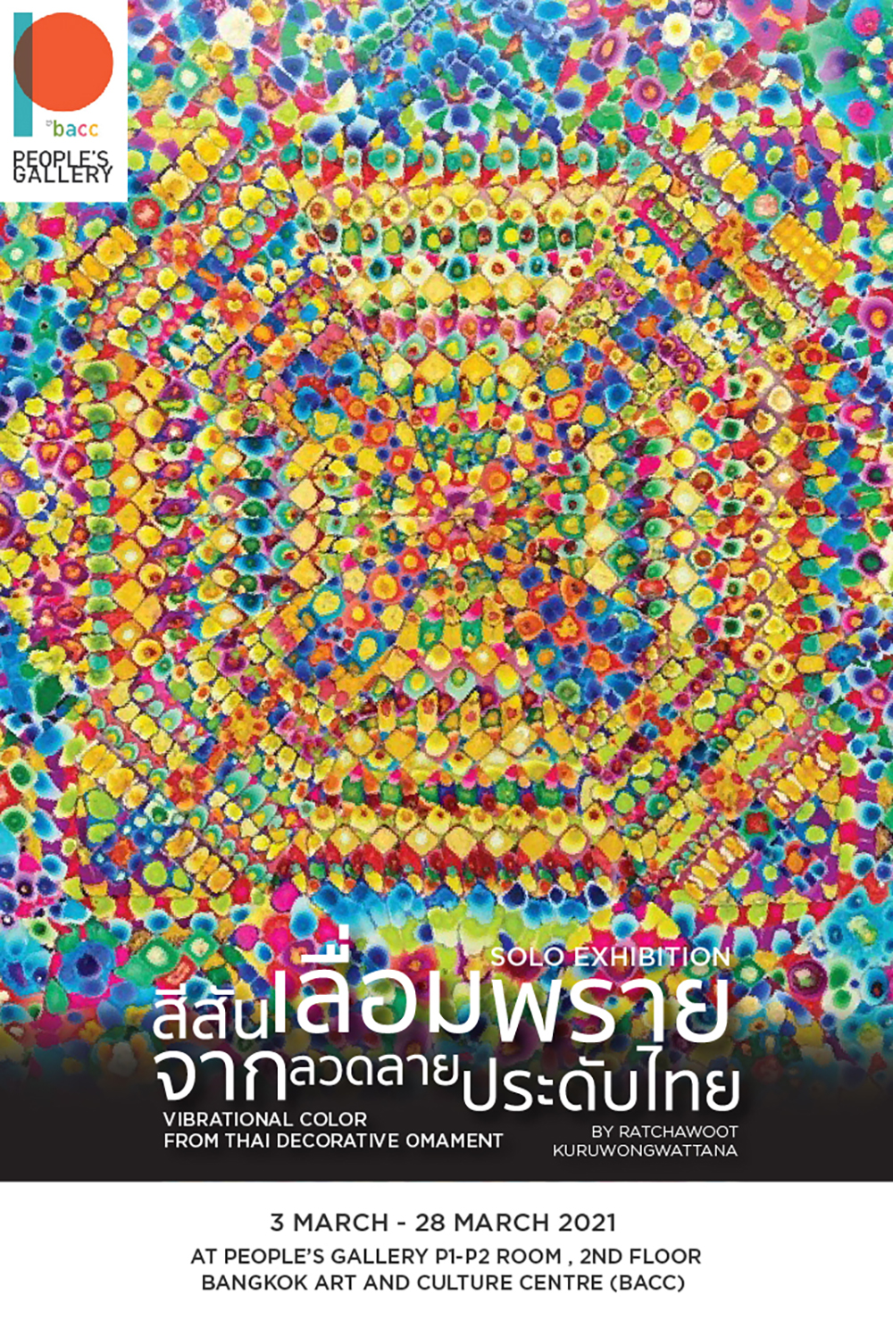 นิทรรศการที่จัดแสดงผลงานของศิลปินที่นำเสนอผลงานด้วยเทคนิคหยดสีที่กระจายตัวเรียงกัน มีเงาเป็นประกายวูบวาบสลับซับซ่อนกันหลายสี แสดงให้เห็นถึงความเคลื่อนไหวอันว่องไวและมีพลัง รูปแบบการหยดนี้พวยพุ่งออกจากจุดกำเนิดไปทุกทิศทาง เปรียบเสมือนการเจริญเติบโตในทุก ๆ ด้านไปพร้อม ๆ กัน อันจะนำมาสู่การอยู่ร่วมกันอย่างสมดุลและยั่งยืน โดยอาศัยหลักการใช้ทัศนธาตุใหม่ร่วมเข้ากับเทคนิคเฉพาะที่ได้สร้างให้เกิดลวดลายสีสันเชื่อมโยงกับมายาคติไทยและพระพุทธศาสนาผสมผสานหลากหลายวัฒนธรรมที่เกี่ยวกับสถาปัตยกรรมของไทย อีกทั้งเป็นการพัฒนาต่อยอดสร้างสรรค์กับความคิดและภูมิปัญญาไทยเข้ามาประยุกต์เพื่อเชิดชูงานศิลปหัตถกรรมมิให้ห่างหายไปจากสังคมไทยยุคปัจจุบัน