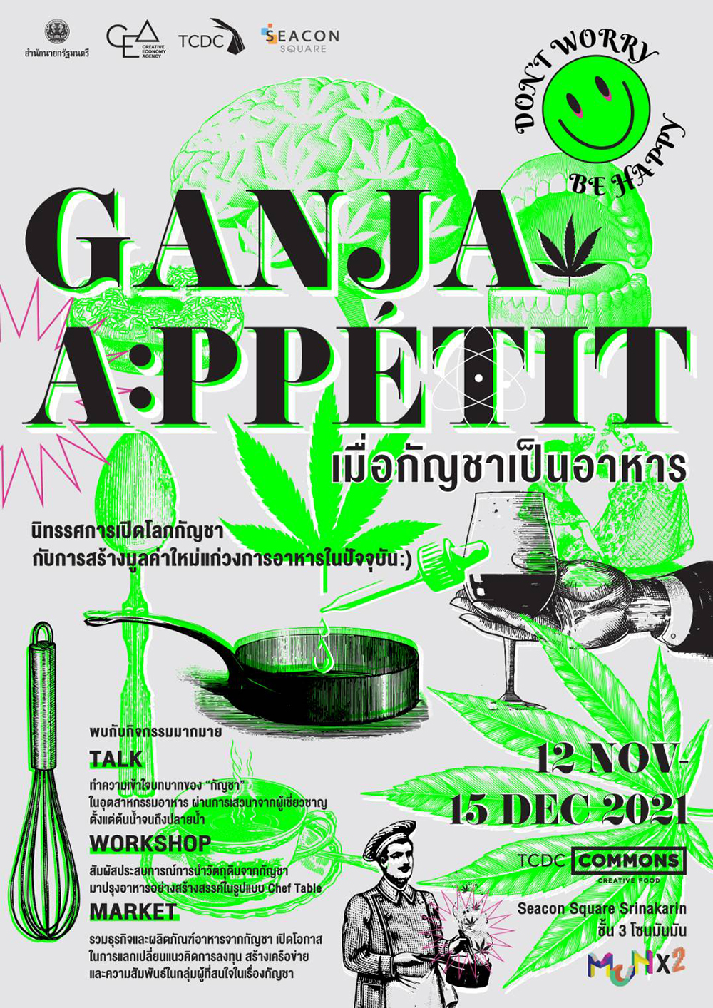 นิทรรศการเปิดโลกกัญชาที่ชวนเราไปเรียนรู้การสร้างมูลค่าใหม่แห่งวงการอาหารแห่งอนาคต จัดขึ้นเป็นครั้งแรกในประเทศไทย ภายในงานพบกับเวทีเสวนาทำความเข้าใจบทบาทของกัญชาในอุตสาหกรรมอาหารจากผู้เชี่ยวชาญตั้งแต่ต้นน้ำจนถึงปลายน้ำ เวิร์กชอปที่เราจะได้ไปสัมผัสประสบการณ์การนำวัตถุดิบจากกัญชามาปรุงอาหารอย่างสร้างสรรค์ในรูปแบบเชฟส์เทเบิล ตลาดนัดที่รวมธุรกิจและผลิตภัณฑ์อาหารจากกัญชามาไว้ที่เดียว เพื่อเปิดโอกาสในการแลกเปลี่ยนแนวคิดการลงทุน สร้างเครือข่ายและความสัมพันธ์ในกลุ่มผู้ที่สนใจในเรื่องกัญชา งานนี้นอกจากจะมีให้ชมแล้ว ยังมีให้ชิมด้วยนะ