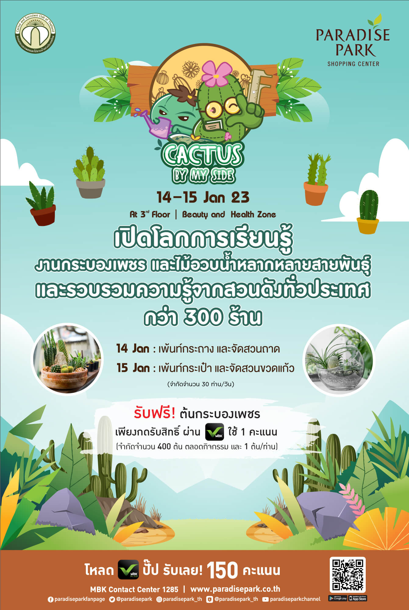 Paradise Park เอาใจคนรักต้นกระบองเพชรอีกครั้ง กับงาน Cactus By My Side ที่จะมาเปิดโลกการเรียนรู้เรื่องการดูแลรักษาน้อง ๆ กระบองเพชรและไม้อวบน้ำทั้งหลายอย่างเป็นกันเอง ความรู้อัดแน่นจากสวนดังทั่วประเทศกว่า 300 ร้านค้า มีกิจกรรมจัดสวนถาด สวนขวดแก้ว ให้เข้าร่วมด้วยนะ