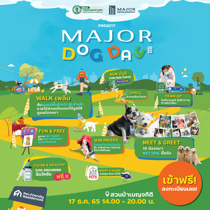 Major Development เจ้าของโครงการคอนโดเลี้ยงสัตว์ได้หลายทำเล ร่วมกับกรุงเทพมหานคร จัดงาน Major Dog Day 2022 ที่เป็นครั้งแรกของการเปิดสวนป่าเบญจกิติโซนใหม่ ชวนให้คนรักน้องหมามาสนุกร่วมกันบนพื้นที่สีเขียวในสวน มาสัมผัสลมหนาว บริหารปอด และรักสุขภาพไปด้วยกัน