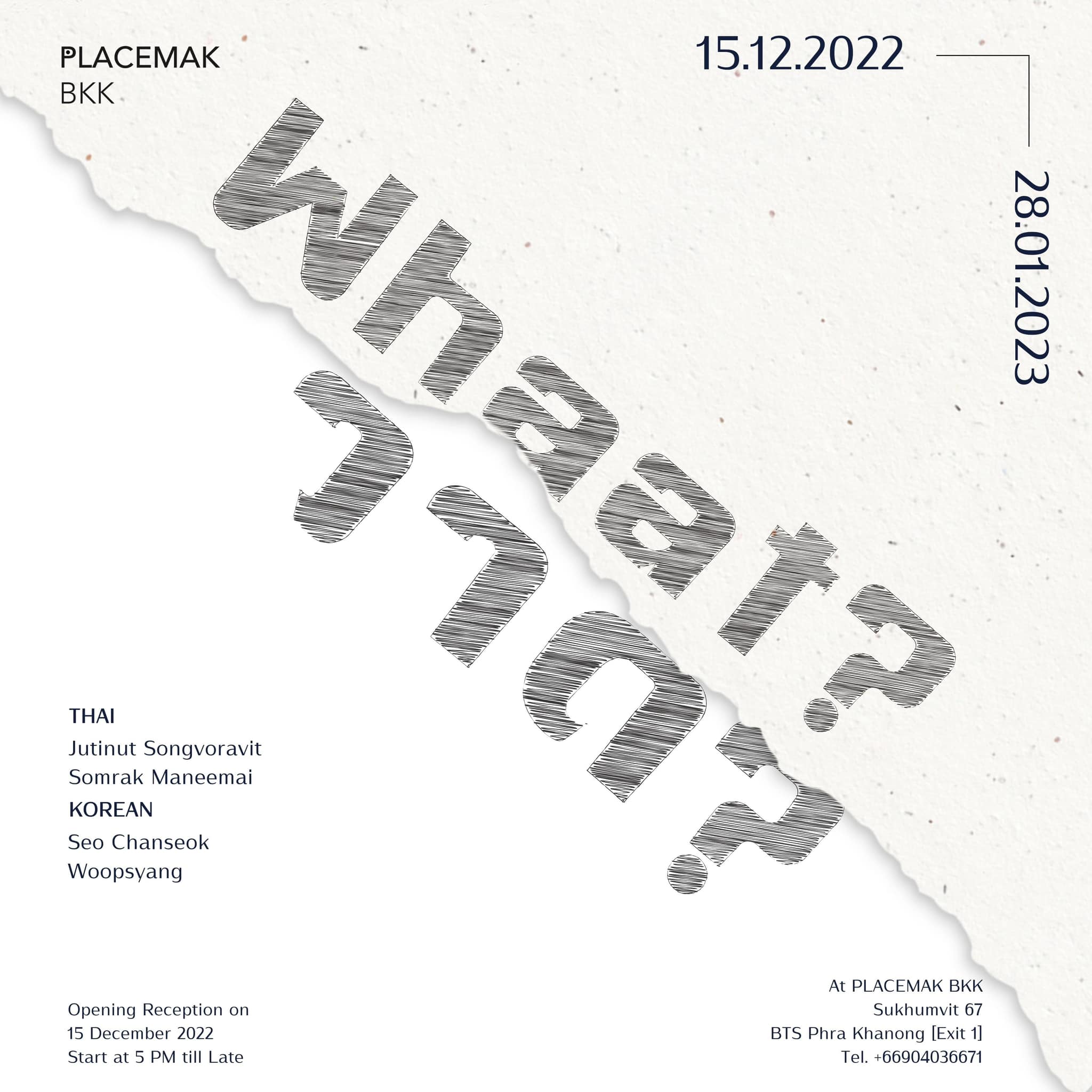วันที่ 15 ธ.ค. 2022 - 28 ม.ค. 2023 เวลาทำการ อังคาร - เสาร์ 10:00 - 18:00 น. อาทิตย์ สามารถนัดหมายล่วงหน้า ที่ Placemak BKK ซ.สุขุมวิท 67 เพิ่มเติมที่ Placemak BKK