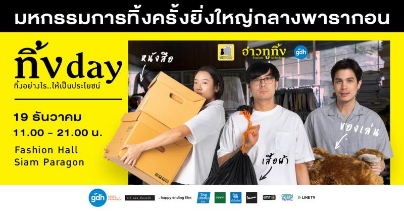ไหน ๆ ใครกำลังเคลียร์บ้านช่วงสิ้นปี วันนี้พี่เต๋อเขาชวนเรามาร่วม ทิ้งday ทิ้งอย่างไรให้เป็นประโยชน์ กิจกรรมที่จะชวนเรามาทิ้งของที่อยากจะตัดใจ ไม่ว่าจะเป็นของเล่นวัยเด็กที่ตอนนี้น้องไปนอนอยู่ในห้องใต้บันไดแล้ว กองเสื้อผ้าตกเทรนด์ที่เราหมดแพชชันจะหยิบมาใส่ หนังสือที่อ่านจบแล้วและอยากส่งต่อให้กับคนอื่น ซึ่งถ้าใครหิ้วของมาร่วมทิ้ง 559 คนแรกก็รับไปเลย ถุงมือเหลืองจากหนังฮาวทูทิ้ง (ไม่ต้องตัดต่อให้เหนื่อยแล้วนะ) นอกจากนี้ยังมีกิจกรรมพิเศษอย่างการแสดงสดเพลงทิ้งแต่เก็บจาก The TOYS พร้อมเจอนักแสดงจากฮาวทูทิ้งอีกด้วย