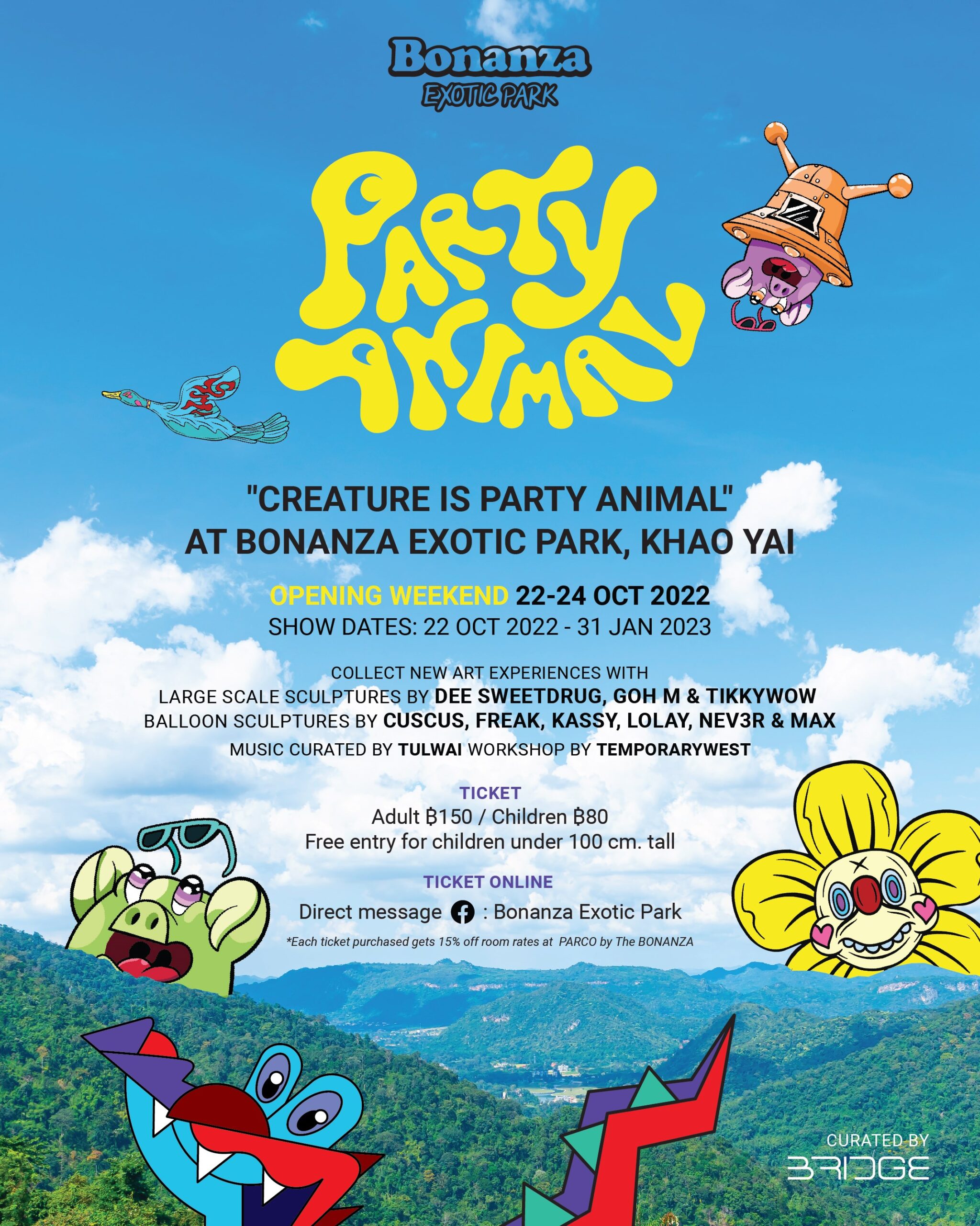 ลองวีกเอนด์นี้ ใครมีแพลนจะแวะเขาใหญ่ เราขอนำเสนอ Creature is Party Animal นิทรรศการจัดแสดงงานศิลปะในสวนสัตว์ ที่จัดโดย Bonanza Exotic Park ร่วมกับ Bridge Art Agency นำเสนอประติมากรรมและบอลลูนอาร์ตกลางพื้นที่แสนร่มรื่น ท่ามกลางสัตว์หาดูยากนานาชนิด พิเศษสุด ๆ ตรงที่สุดสัปดาห์นี้เขาจะจัดกิจกรรมเปิดตัวนิทรรศการแบบเต็ม ๆ ก่อนจะจัดแสดงชิ้นงานยาวไปถึงต้นปีหน้า