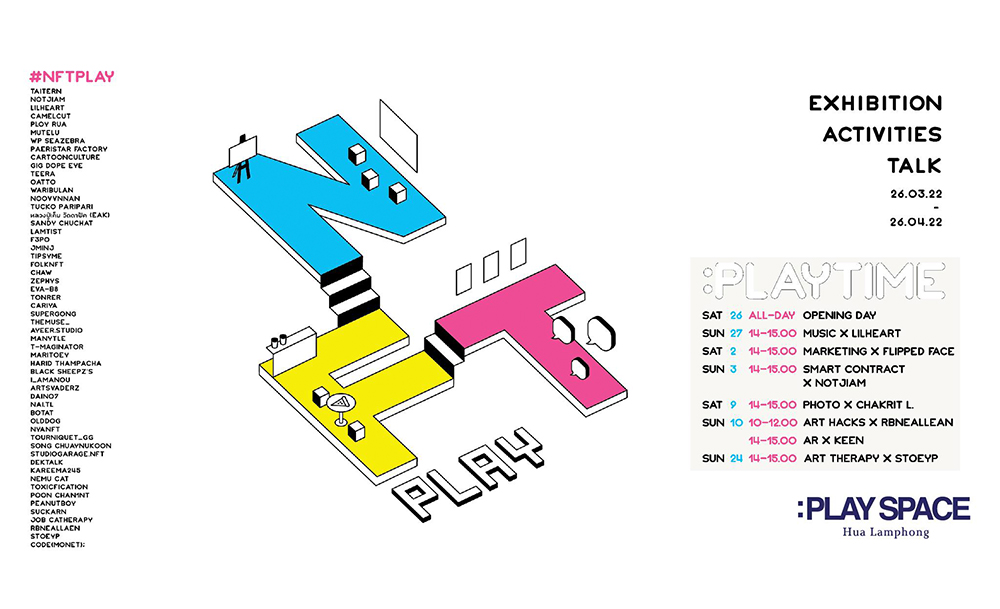 นิทรรศการและกิจกรรมเกี่ยวกับ NFT ที่รวบรวมผู้สร้างสรรค์ผลงาน NFT กว่า 50 ผลงาน มาจัดแสดงและสนทนาในประเด็นต่าง ๆ ที่เกี่ยวข้องกับแวดวงศิลปะดิจิทัลสุดมาแรงนี้ ไม่ว่าจะเป็น การทำมาร์เกตติง, การทำสมาร์ตคอนแทกต์, NFT ดนตรี, NFT ภาพถ่าย จนไปถึงเวิร์กชอป หรือจะมานั่งวาดรูปกันเพลิน ๆ และไขข้อข้องใจเรื่อง NFT จาก NFT Player ที่ผ่านสนามมาแล้วก็ไม่ติด