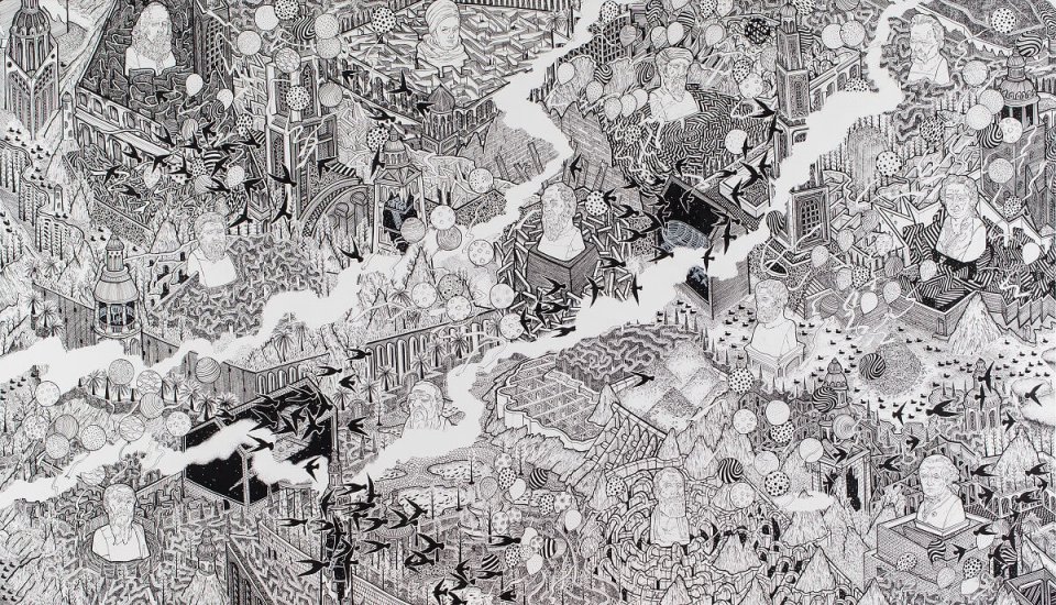ขวัญชัย ลิไชยกุล ซ่อนปริศนาไว้ในงานจิตรกรรมภาพวาดแบบ Bird Eyes’ View อันเป็นเอกลักษณ์ โดยนิทรรศการ Metrospection จะชวนให้เราพิจารณาถึงวิถีชีวิตในสังคมเมืองสุดอลหม่านผ่านสัญลักษณ์ต่างๆ ทั้งวัตถุ สถานที่ สิ่งก่อสร้างที่ผุพัง เขาวงกต และกลุ่มนกที่เฝ้ามองสถานการณ์ในเมือง