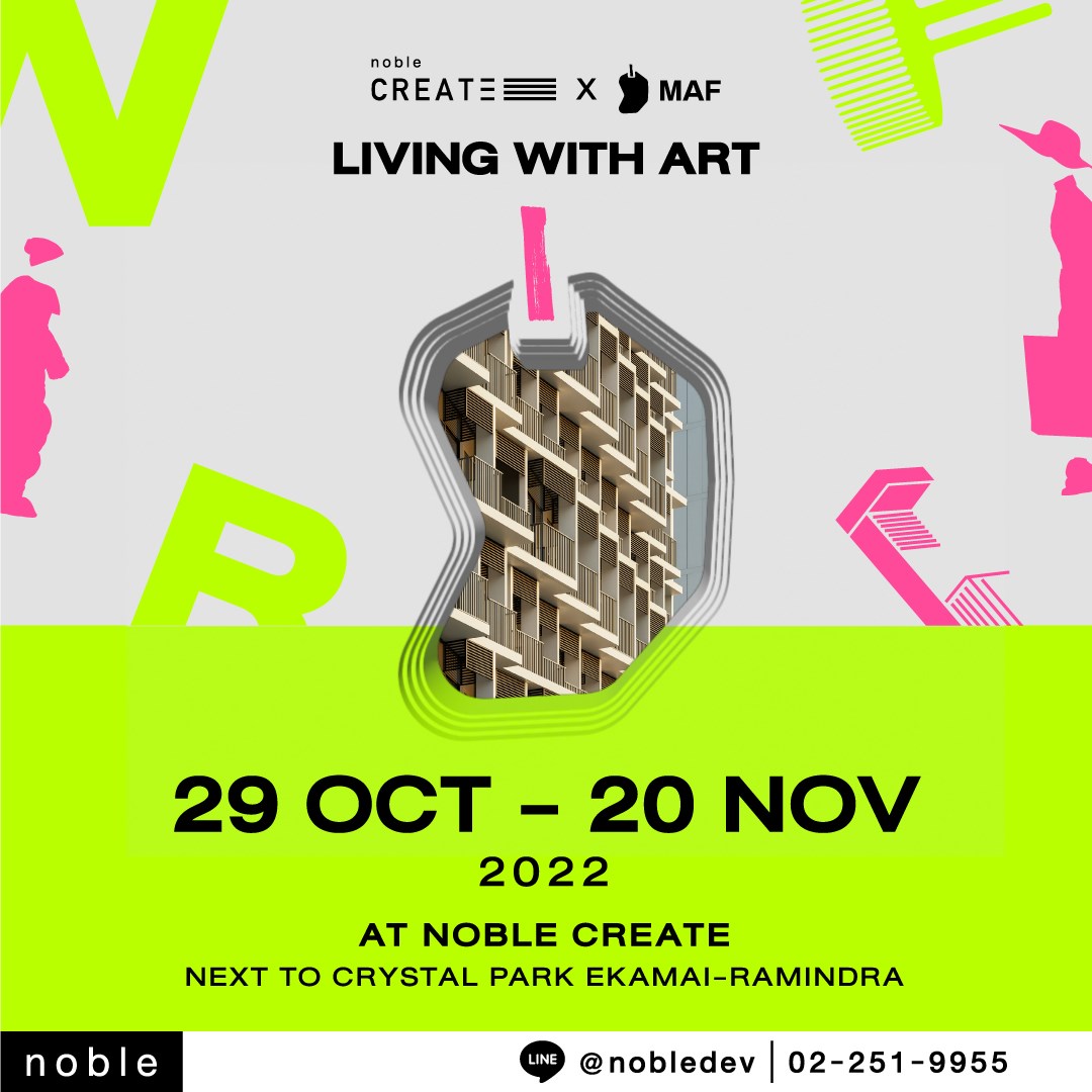 ปิดท้ายอิเวนต์แนะนำสุดสัปดาห์นี้ กับงาน LIVING WITH ART ที่เป็นโปรเจกต์ Noble Create x Mango Art Festival ที่เขานำเอางานศิลปะน่าสะสมจากศิลปินชั้นนำ นำโดย ธนชัย อุชชิน (ป๊อด Moderndog), Nev3r, Linecensor และ Mamablues รวมถึงศิลปินสตรีตอาร์ตอย่าง Alex Face, Benzilla, Bonus TMC และอื่น ๆ มาไว้ในห้องตัวอย่างและสำนักงานขายคอนโด Noble Create เลียบทางด่วนเอกมัย-รามอินทรา แถมยังมีเวิร์กชอปดี ๆ ให้เข้าร่วมด้วย!