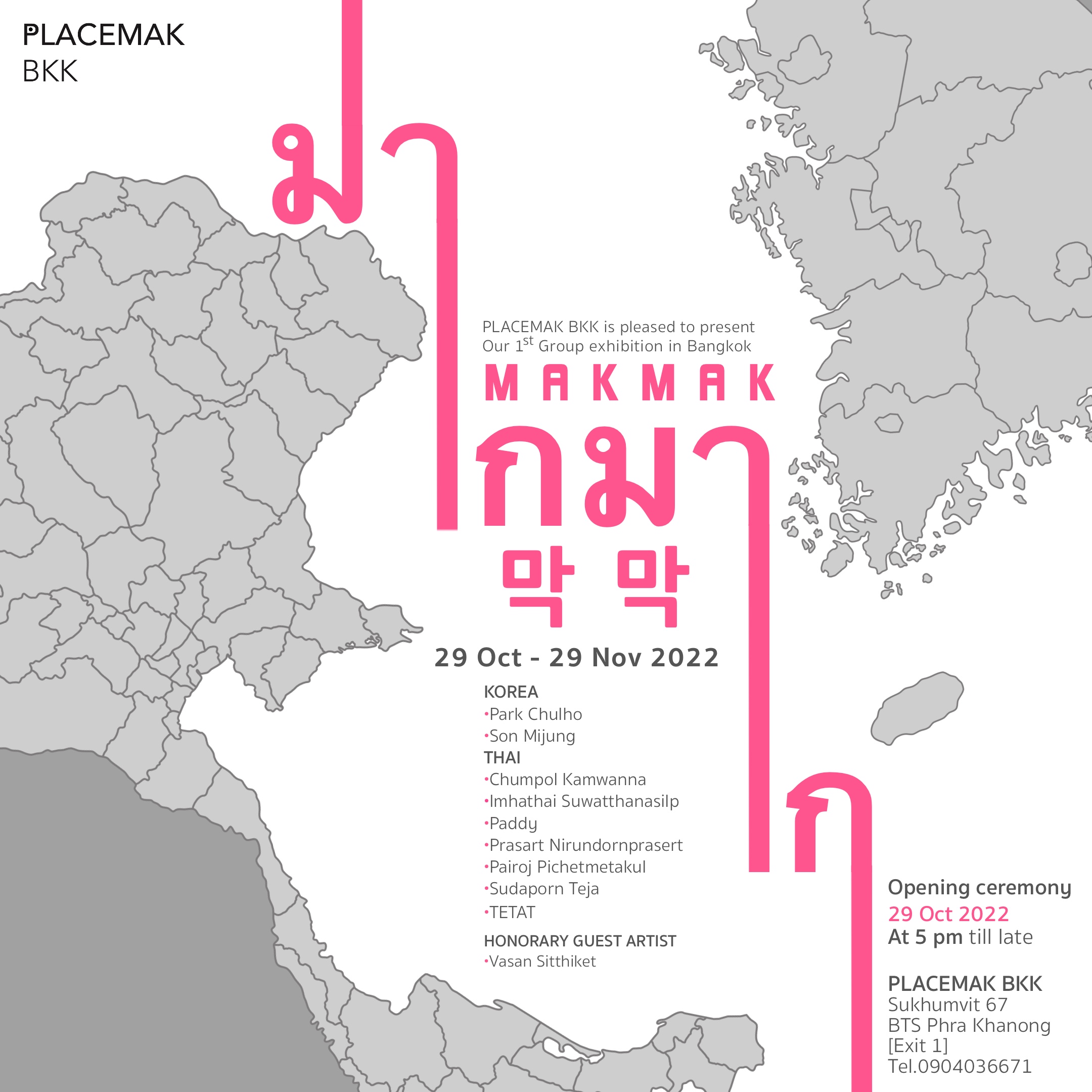 มากันที่งานเปิดตัวแกลเลอรี PLACEMAK (เพลสมาก) ครั้งแรกในไทย PLACEMAK BKK (จากที่เครือนี้มีเปิดทำการในเกาหลีอยู่แล้ว) กับงาน มากมาก makmak 막막 นิทรรศการรวมตัวกันระหว่างศิลปินไทยกับศิลปินเกาหลี ทั้งฝั่งศิลปินเกาหลี พักชอลโฮ, ซนมีจอง และศิลปินไทยอย่าง ชุมพล คำวรรณะ, อิ่มหทัย สุวัฒนศิลป์, Paddy, ประสาท นิรันดรประเสริฐ, ไพโรจน์ พิเชษฐ์เมธากุล, สุดาภรณ์ เตจา, TETAT รวมถึงศิลปินรับเชิญพิเศษ วสันต์ สิทธิเขตต์
