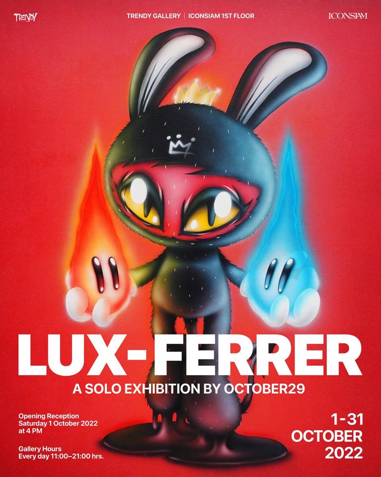 ปิดท้ายราวนด์อัปสัปดาห์นี้ด้วยนิทรรศการศิลปะที่หลายคนรอคอย กับนิทรรศการเดี่ยวเต็มรูปแบบครั้งแรกของ แพน ฐกฤต ครุธพุ่ม หรือ October29 ภายใต้ชื่อ LUX-FERRER ที่มีความหมายว่า 'ผู้นำมาซึ่งแสงสว่าง' เพราะศิลปินเปรียบนิทรรศการนี้ว่าเป็นเหมือนแสงสว่างที่ส่องทางชีวิตเขา หลังจากรู้สึกอิ่มตัวและหมดไฟในการทำงานไป การหวนกลับมาสร้างงานศิลปะที่สะท้อนตัวตนของเขาในครั้งนี้เลยกลายเป็นการนำเสนอชิ้นงานสไตล์ที่ผู้ชมอาจไม่เคยเห็นมาก่อน