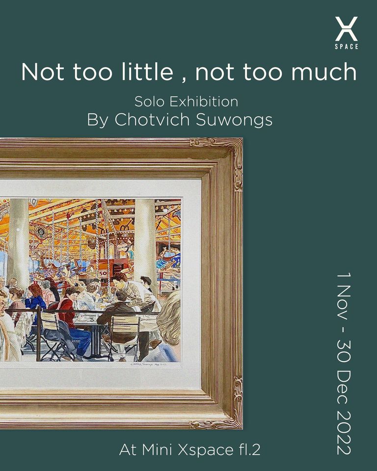 มาที่อีกนิทรรศการหนึ่งในพื้นที่เดียวกันอย่าง Not too little, not too much ที่ถ่ายทอดการพัฒนาที่ไม่สิ้นสุดของ โชตวิชช์ สุวงศ์ จากการเป็นช่างภาพนิตยสารสู่ศิลปินอิสระ ศิลปินเป็นผู้สัมผัสการเปลี่ยนผ่านมาหลายยุคสมัย และเชื่อว่าทุกสิ่งจะดำรงอยู่ได้ด้วยความ 'ไม่มากไม่น้อย' จึงเป็นที่มาของชื่องานในครั้งนี้