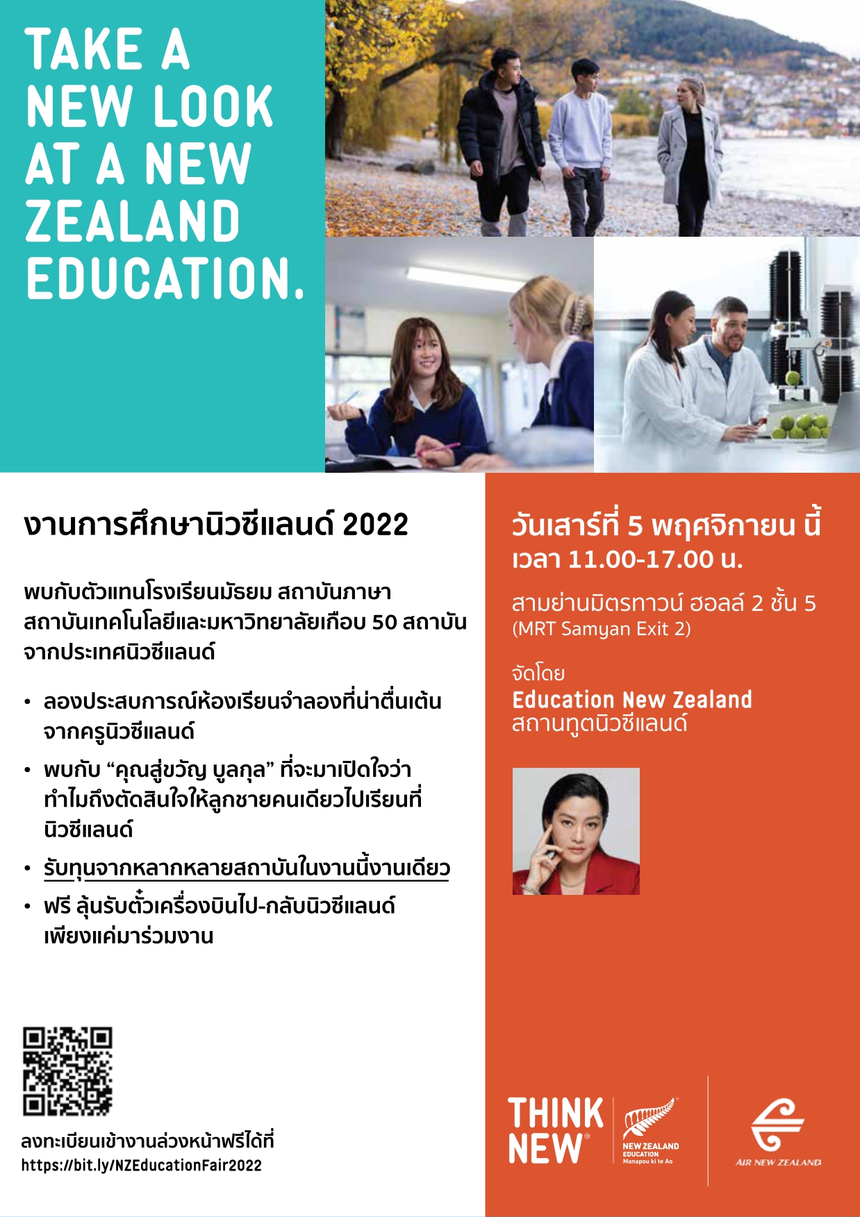 วันที่ 5 พ.ย. เวลา 11:00 - 17:00 น. ที่ Samyan Mitrtown (สามย่าน มิตรทาวน์) ลงทะเบียนร่วมกิจกรรมห้องเรียนจำลองที่ bit.ly/Simulatedclassreg ลงทะเบียนร่วมงานที่ bit.ly/NZEducationFair2022 เพิ่มเติมที่ fb.com/Learnnewzealand