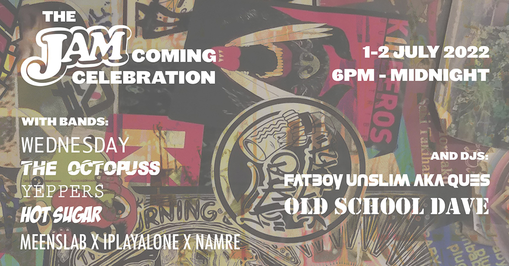 ปาร์ตี้ต้อนรับการกลับมาของบาร์สุดฮิปแห่งย่านคลองสาน งานนี้ไม่มีค่าเข้า แค่พกเอเนอร์จีบวก ๆ มาร่วมกันสร้างประสบการณ์ร่วมกันก็พอ แน่นอนว่าการกลับมาของ Jam ทั้งที งานนี้เลยมีทั้งวงดนตรีและดีเจมาจอยกันแบบคับคั่ง ตั้งแต่ Wednesday, The Octopuss, Yeppers, Hot Sugar, Meenslab x iPlayAlone x Namre และทีมดีเจอย่าง Fatboy Unslim aka Ques และ Old School Dave