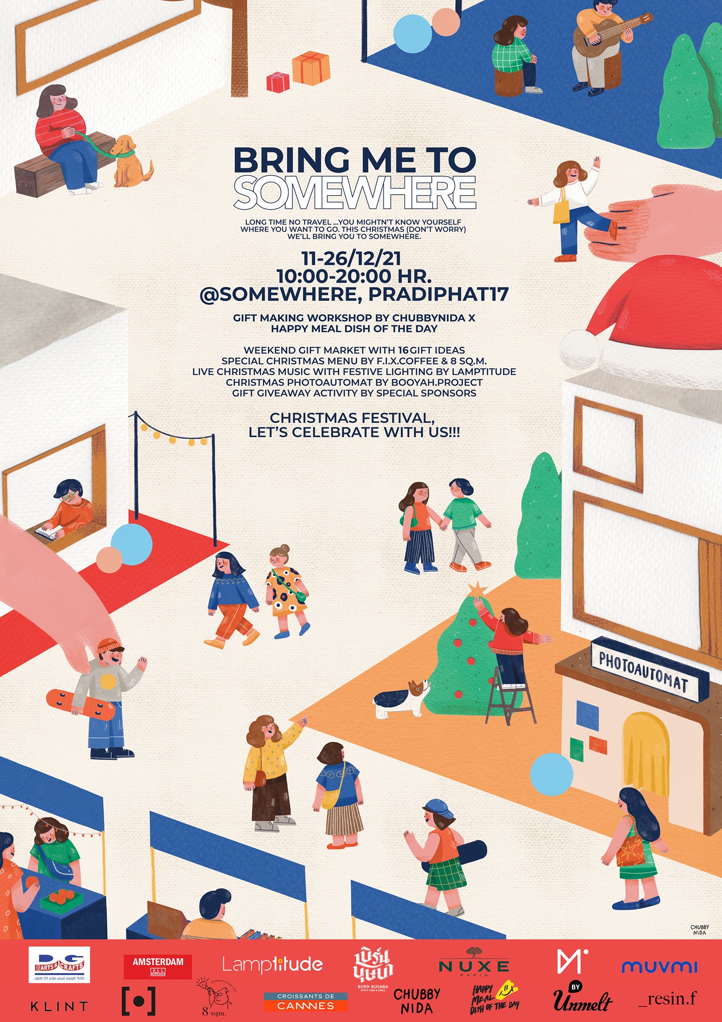 เทศกาลสำหรับคนที่อยากฉลองบรรยากาศคริสต์มาสผ่าน 6 กิจกรรมตลอดเดือน ธ.ค. ตั้งแต่ Gift Making Workshop by Chubbynida x Happy Meal of the day เวิร์กชอปสร้างสรรค์ของขวัญแห่งความทรงจำ, Weekend Gift Market ตลาดรวม 16 ไอเดียของขวัญส่งความสุข, Special Christmas Menu by F.I.X Coffee & 8 Sq.m ชิมเมนูเครื่องดื่ม ขนม และไก่ทอดคาราเกะสูตรพิเศษในเทศกาลคริสมาสต์, Live Christmas Music with Festive ฟังดนตรีสดพร้อมการตกแต่งไฟเทศกาลสุดรื่นรมย์, Chirstmas Photoautomat by Booyah.project เก็บบันทึกความประทับใจผ่านตู้ถ่ายภาพในธีมคริสต์มาส และ Gift Giveaway Activity by Special Sponsors กิจกรรมแจกของขวัญตลอดงาน