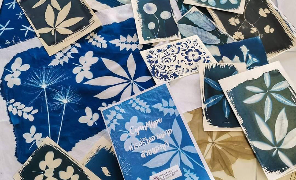 เวิร์กชอปศิลปะที่เราอยากพุ่งตัวไปมากที่สุด! เพราะในคลาสนี้เราจะได้ไปเรียนรู้เทคนิคการสร้างลวดลายงานศิลปะโดยกระบวนการพิเศษที่คล้ายกับกระบวนการอัดรูปในยุคแรก ๆ โดยเราจะได้ไปสร้างงานศิลปะบนกระดาษหรือผ้าที่เคลือบสารไวแสงยูวี และเมื่อนำฟิล์มเนกาทีฟสเตนซิล ใบไม้ ดอกไม้ หรือวัตถุอื่น ๆ ไปวางบังแสงไว้ แล้วนำไปตากแดดหรือหลอดแสงยูวี ส่วนที่โดนแสงเปลี่ยนเป็นสีน้ำเงิน