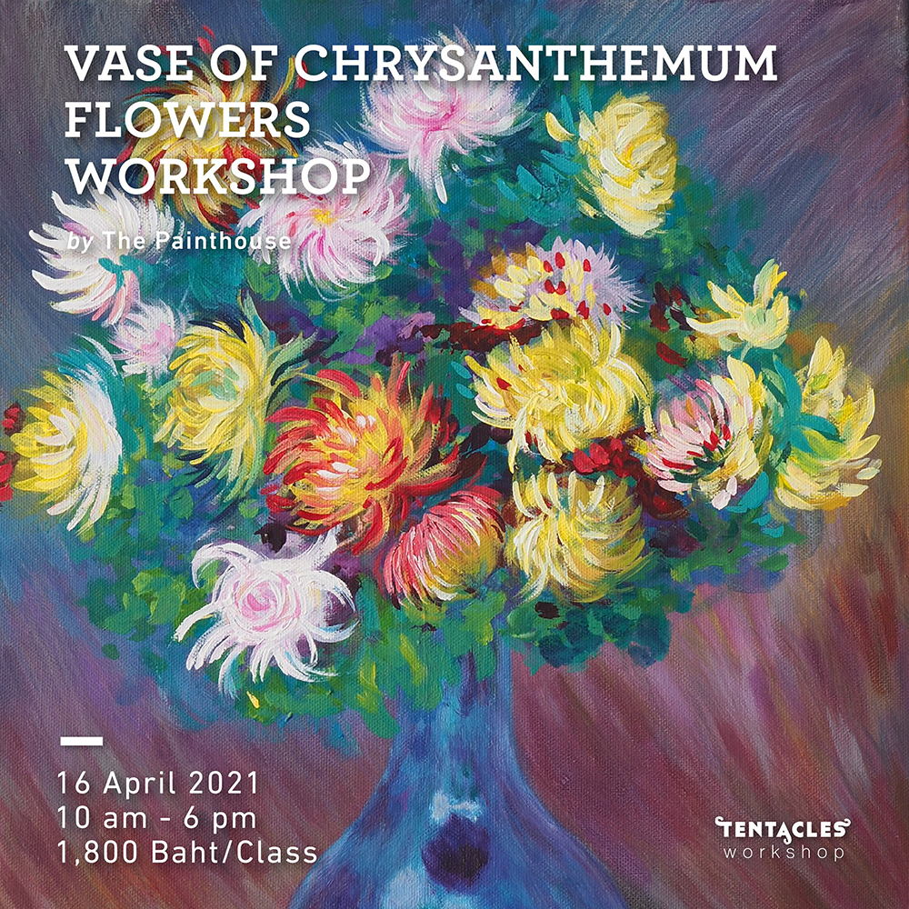 เวิร์กชอปวาดสีอะคริลิกในสไตล์ภาพวาดของ โคลด โมเนต์ กับภาพ Vase of Chrysanthemum Flowers ซึ่งเป็นหนึ่งใน 20 ภาพ ดอกไม้ Still Life ที่โมเนต์วาดในช่วงปี 1878 และ 1882 ในภาพนี้ประกอบไปด้วยดอกเบญจมาศสีสันสดใสในแจกันแก้ว ระหว่างที่เขาพำนักที่เมือง Vétheuil และ Poissy แสดงให้เห็นว่าตัวศิลปินเองยังค้นคว้าศึกษาทดลองในแนวทางศิลปะของตนเองตลอดเส้นทางอาชีพของเขา
