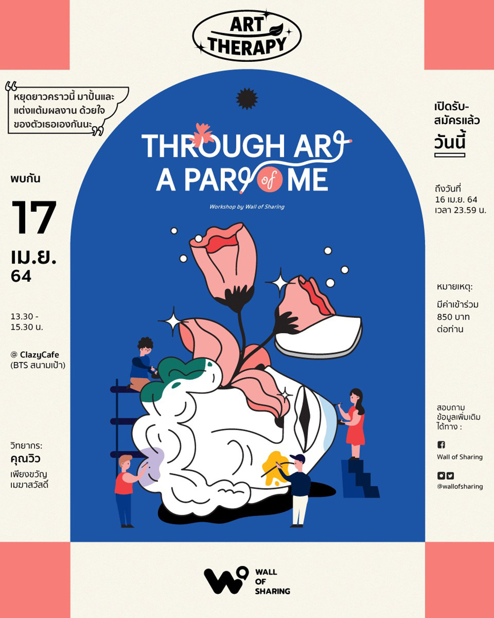 13:30 - 15:30 น. Clazy Cafe' ถ.พหลโยธิน BTS สนามเป้า ลงทะเบียนเข้าร่วมได้ ที่นี่ สอบถามข้อมูลเพิ่มเติมที่ fb.com/wallofsharing