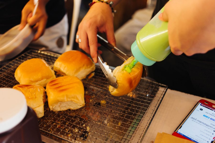 ขนมปังปิ้งไส้ทะลักที่แค่เห็นภาพก็น้ำลายสอร้านอยู่ในตลาดนางเลิ้ง ย่านเสาชิงช้า ร้านเดียวกับบะหมี่บุญเลิศ ทีเด็ดคือไส้ขนมปังหลากชนิด ทั้งสังขยาใบเตย หมูยองน้ำพริกเผา ถั่วแดง ที่ตัวขนมปังปิ้งร้อนๆ กับไส้เยิ้มๆ ทำเอาเราอดใจไม่ไหว ราคาอยู่ที่ชิ้นละ 20 บาท