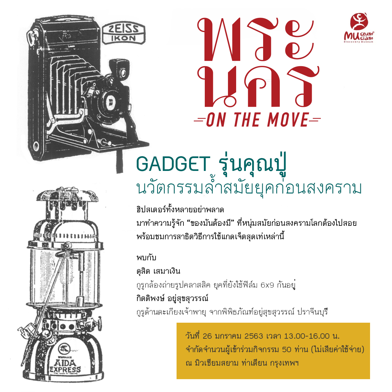 สิ่งของเองก็ถูกเปลี่ยนไปตามเทรนด์ ตามยุคสมัย หลายอย่างที่เคยเห็นจนล้นบ้านล้นเมืองในสมัยก่อน สมัยนี้ก็แทบไม่มีให้เห็นแล้ว อิเวนต์ Gadget รุ่นคุณปู่ นวัตกรรมล้ำสมัยยุคก่อนสงคราม จึงเป็นการพาเราไปรู้จักไอเทมฮิป ๆ สมัยรุ่นคุณปู่หรือรุ่นสงครามโลก ไม่ว่าจะเป็น ตะเกียงเจ้าพายุจากเยอรมัน, กล้องฟิล์มขนาด 6x9 และระบบบันทึกภาพ Outdoor ที่สมัยนั้นเรียกได้ว่าล้ำสุด ๆ โดยงานนี้ได้เหล่าเซียนที่รู้จักไอเทมเหล่านี้ดีมาเล่าประวัติศาสตร์เบื้องหลังด้วยนะ แถมยังลงทะเบียนฟรีด้วย รีบลงด่วน เดี๋ยวจะเต็มเอา