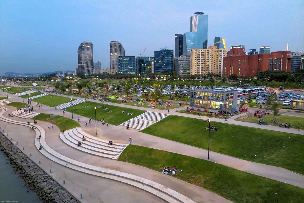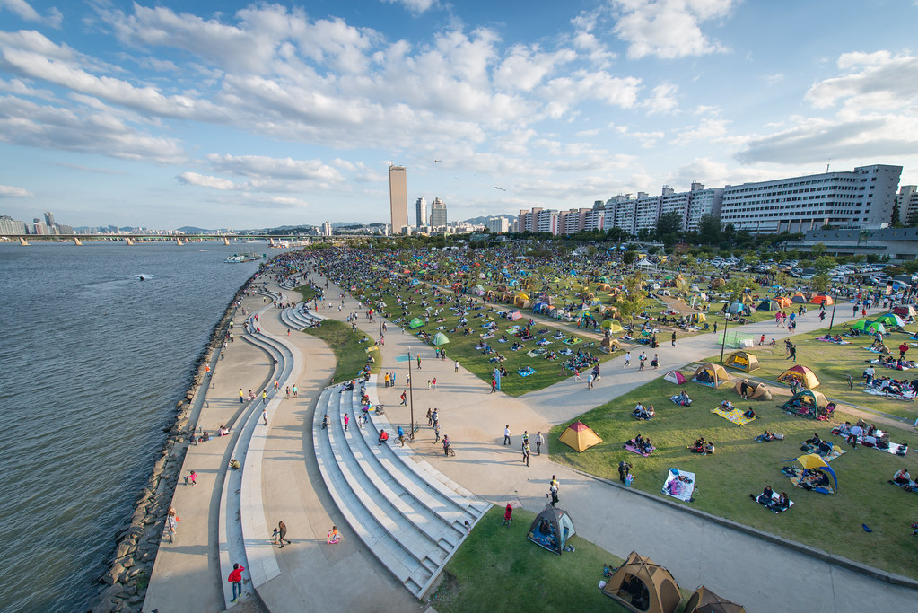 อย่างที่รู้ ๆ กันว่าโซลนั้นมีขนาดเล็กนิดเดียว พื้นที่สาธารณะที่ชิล ๆ ก็ไม่ค่อยมีให้ใช้สอย พื้นที่ข้างแม่น้ำที่เปรียบดั่งเส้นเลือดของโซลก็เป็นอีกหนึ่งสถานที่ี่ที่ชิลที่สุด แถมทางรัฐยังจัดสรรพื้นที่เอาไว้อย่างดีเพื่อรองรับการใช้งานของประชาชนอีกด้วย คนส่วนใหญ่จะชวนเพื่อน ๆ หรือครอบครัวไปนั่งเล่นกัน พาสัตว์เลี้ยงตัวเองมายืดเส้นยืดสาย หรือมาออกกำลังกาย ส่วนสายกินอย่างเราก็ต้องเอาตามคนเกาหลีสักหน่อย บริเวณใกล้ ๆ นั้นจะมีร้านสะดวกซื้อที่ขายรามยอน (บะหมี่กึ่งสำเร็จรูป) อาหารยอดฮิตของคนเกาหลีอยู่ และยังสะดวกมาก ๆ เพราะมีชามและเครื่องต้มรามยอนให้บริการพร้อม (รามยอนของเกาหลีต้องต้มนะ แค่กดน้ำทิ้งไว้ 3 นาทีนั้นเส้นไม่สุกจ้า) เสร็จแล้วก็ถือมานั่งล้อมวงกินไปเม้าไปกันได้เลย