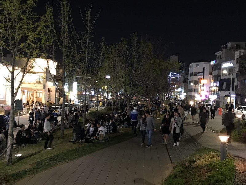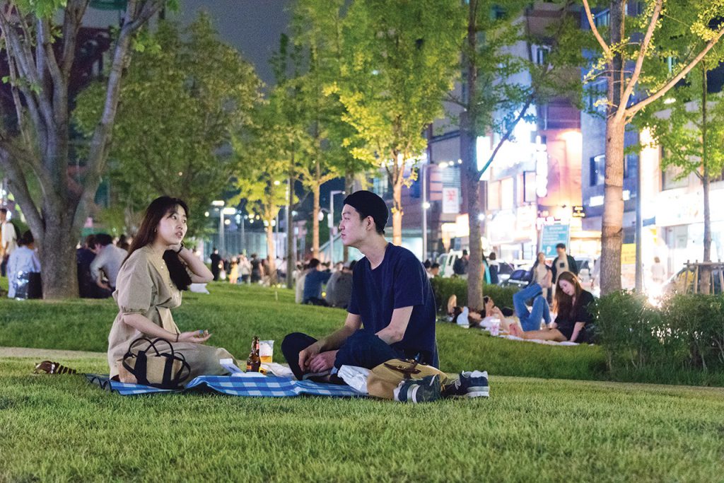 แต่บริเวณที่เราชอบต้องยกให้โซนสวนสาธารณะ หากมาช่วงเวลาเย็น ๆ หลังเลิกงาน เราจะมีโอกาสได้เห็นคนเกาหลีทั้งวัยรุ่น วัยทำงาน จับกลุ่มกันนั่งพูดคุยตามมุมต่าง ๆ ของสวนแห่งนี้ บ้างก็ขนผ้ามาปูนั่งตากลมกันอย่างสบายใจ ส่วนอาหารการกินก็ไม่ต้องห่วง เพราะขนาบสวนไปทั้ง 2 ฝั่งนั้นเต็มไปด้วยร้านขายอาหารแบบ To go ทั้งสเต็กก็ออกแบบมาเก๋ไก๋ให้จานตั้งอยู่บนปากแก้วใส่เครื่องดื่มได้ ร้านจาจังมยอน รามยอน ต๊อกบกกี ร้านสะดวกซื้อ ไปจนถึงร้านคราฟต์เบียร์และเครื่องดื่มแอลกอฮอล์ ใครที่อยากสังสรรค์ในบรรยากาศสบาย ๆ แถมยังสบายกระเป๋าด้วย ก็ลองมาที่ยอนนัมดงได้เลย แต่มาช้าระวังไม่มีที่นั่งนะ บอกเลยว่าที่นี่ฮอตจริง ๆ