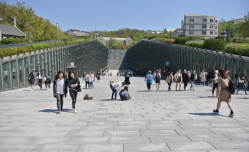 นอกจากสถานที่เที่ยวทั่วไปแล้ว อีกหนึ่งสถานที่ที่นักท่องเที่ยวชอบแวะไปคือมหาวิทยาลัย เพราะมหาวิทยาลัยในโซลนั้นมีปสะวัติที่น่าสนใจ แถมยังมีสถาปัตยกรรมที่สวยงาม ควรค่าแก่การไปเซลฟี่เป็นอย่างมาก และหนึ่งในมหาวิทยาลัยที่ใคร ๆ ก็ต้องไป คือมหาวิทยาลัยสตรีอีฮวา (Ehwa Womans University) กับมุมมหาชนอย่างการยืนเก๋ ๆ มีแบ็กกราวน์เป็นตึกสีเงินที่เจาะภูเขาสร้างเข้าไปเก๋ไก๋สไลเดอร์
