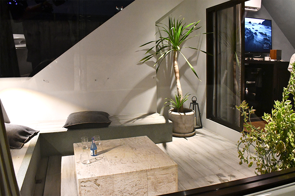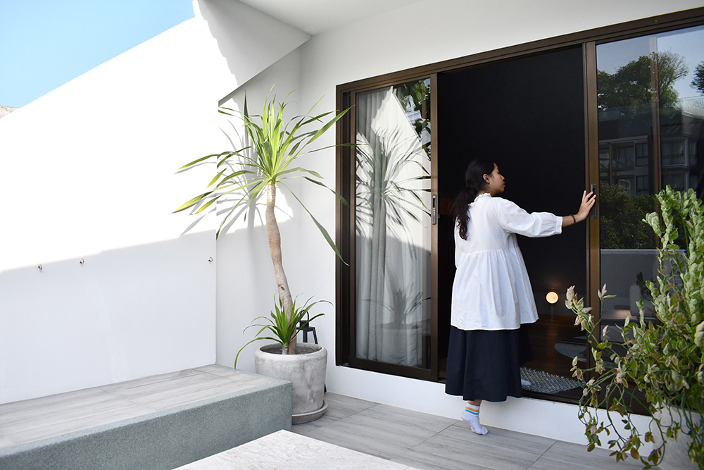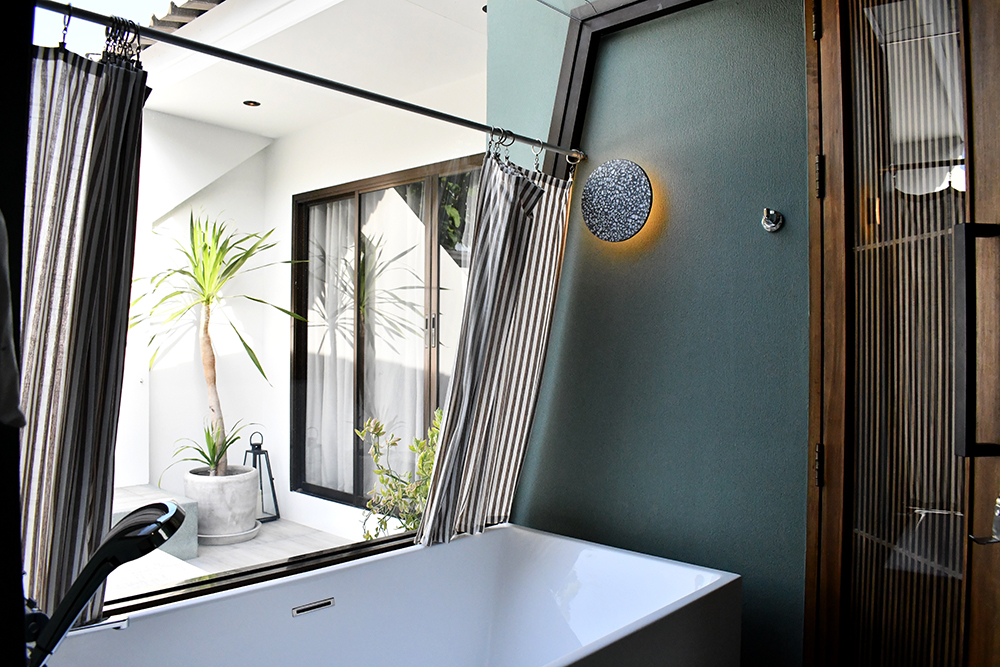 มาถึงโซนห้องน้ำที่ถือเป็นไฮไลต์ไม่แพ้โซนเตียงนอนและห้องนั่งเล่น เพราะอ่างอาบน้ำที่นี่ถูกจัดวางไว้ในมุมที่สามารถเปิดม่านลายทางออกไปมองวิวระเบียงด้านนอกได้แบบพอดิบพอดี โดยเจ้าระเบียงที่ว่านี้ถือเป็นอีกหนึ่งจุดเช็กอินที่ทำให้เราเลือกจองห้อง Neil เพราะนอกจากจะเป็นระเบียงเอาต์ดอร์แบบโอเพ่นแอร์ที่เชื่อมต่อกับห้องนั่งเล่นและอ่างอาบน้ำแล้ว ในตอนกลางคืนเราสามารถเอาเบาะมาปูแล้วนั่งทำงานหรือนั่งสังสรรค์กับเพื่อนท่ามกลางท้องฟ้าสวย ๆ ของกรุงเทพมหานครได้อีกด้วย
