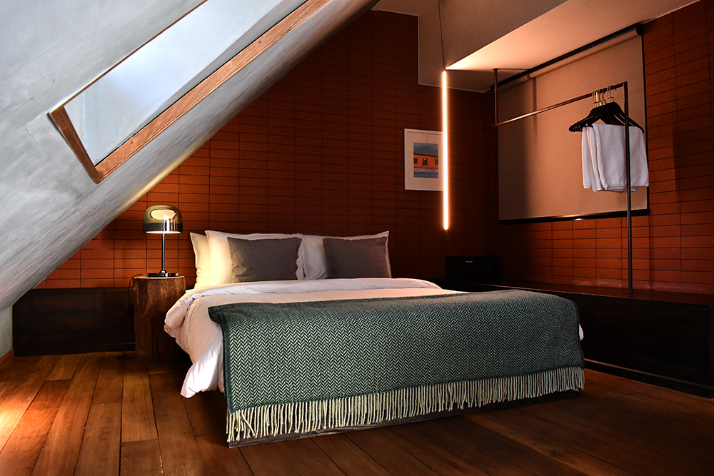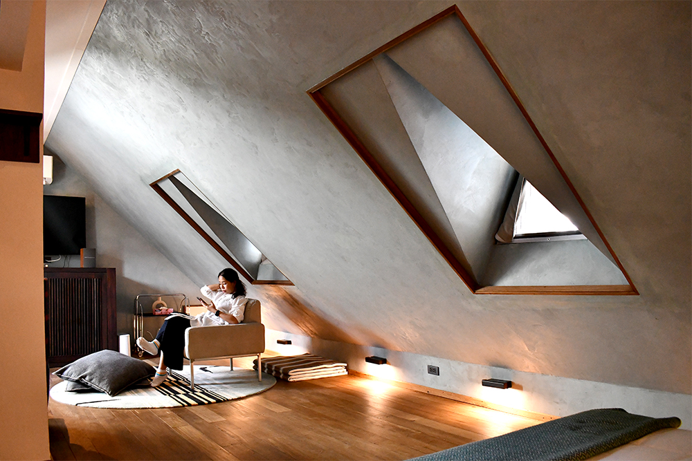 ความน่ารักอีกอย่างคือชื่อห้องพักที่จะถูกเรียกแทนด้วยชื่อคน เป็นตัวแทนของนักเดินทางที่เป็นมีสไตล์เฉพาะตัวตามแต่ละห้อง โดยห้องของเราในวันนี้ชื่อ Neil เป็นห้องพักอยู่ชั้นบนสุดของตัวบ้าน จุดเด่นของห้องนี้คือเพดานที่เอียงลาดลงมาตามโครงสร้างของหลังคาบ้าน ซึ่งเป็นรูปแบบห้องพักที่แทบจะหาไม่ได้ที่ไหนอีกแล้วในกรุงเทพฯ ใครที่ชอบฟีลแบบห้องใต้หลังคาของบ้านในสไตล์นอร์ดิก เราเชื่อว่าจะต้องหลงรักห้องนี้จนไม่อยากเช็กเอาต์แน่ ๆ