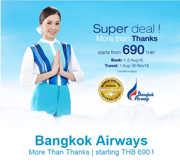 สำหรับคนที่กำลังจะวางแผนไปเที่ยวตั้งแต่วันที่ 1 ส.ค. เป็นต้นไป ทาง Bangkok Airways สายการบินบูติกชั้นนำในประเทศกำลังจะปล่อยโปรโมชั่น Super Deal! ลดกระหน่ำสุดๆ โดยเริ่มต้นที่ 690 บาทเท่านั้น!