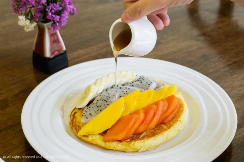 โดยทุกห้องจะมีอาหารเช้าให้ด้วย จะเป็นแบบ Breakfast a la carte ให้เราเลือกได้ถึง 16 เมนู ที่ไม่เป็นบุฟเฟ่ต์แบบโรงแรมทั่วไปเพราะคุณเกศต้องการให้เราได้ทานอาหารสดใหม่จากครัว โดยจะมีผลไม้ตามฤดูกาลผลัดเปลี่ยนในบางเมนู และเมนู signature ที่คุณเกศแนะนำเลยก็คือ Pancake สอดไส้ผลไม้ ที่จะมาแบบแผ่นใหญ่เต็มจาน หนานุ่ม ทานคู่กับผลไม้และราด maple syrup บอกเลยว่าทั้งอิ่มทั้งฟินกันตั้งแต่เช้า นอกจากนี้ยังมีเมนูพื้นที่อย่างไส้อั่วและหมูปิ้งทานคู่กับข้าวเหนียว จะจัดหนักกันตั้งแต่เช้าก็ย่อมได้ ในส่วนของกลางวันโรงแรมก็มี Sandwich และ อาหารไทยคลาสสิคอย่างแกงพะแนง แกงเขียวหวานและผัดกะเพรา นอกจากนี้ในตอนเย็นยังมี Local beer อย่าง Red truck และ Chiangmai Blossom Weizen ขายอีกด้วย