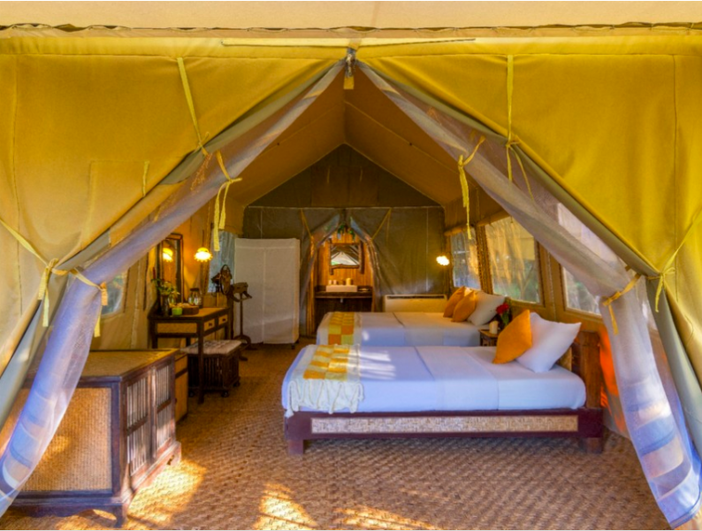 ซึ่งนี่คือเทรนด์ใหม่ของนักท่องเที่ยวทั่วโลกที่เราอยากพาทุกคนมาสัมผัส กับเทรนด์ที่มีชื่อเก๋ ๆ ว่า 'Glamping' โดยรวมเอาคำว่า Glamourous มาผสมกับคำว่า Camping แปลง่าย ๆ คือการมาออกแคมป์แบบหรูหราไฮโซนั่นเอง! ใครที่จินตนาการว่ามาป่ามาเขาต้องสมบุกสมบัน เราบอกเลยว่าเอ้าท์ไปแล้ว เพราะนี่คือแคมป์ติดแอร์ที่ด้านในห้องพักให้ฟีลเหมือนหลุดเข้าไปอยู่ในเรื่องอินเดียน่าโจนส์ก็ไม่ปาน แต่เต็มไปด้วยสิ่งอำนวยความสะดวกครบครัน ทั้งแอร์ ห้องน้ำอาบน้ำพร้อมเครื่องทำน้ำอุ่น เตียงนุ่ม ๆ ตู้เย็น ไปจนถึงไดร์เป่าผมเขาก็ยังมีให้ เอาง่าย ๆ ก็เหมือนยกโรงแรมหลายดาวมาไว้ในเต๊นท์ขนาดยักษ์นั่นเอง!