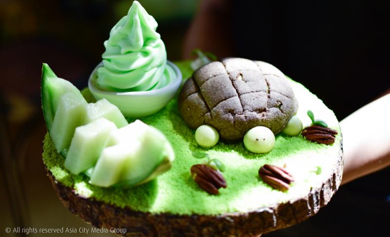 มาถึงร้านนี้ เขาบอกว่าถ้าไม่ได้ลองขนมหวานจานเด็ดอย่าง เต่าปังลุยสวน (185 บาท) ก็จะถือว่ามาไม่ถึง! เพราะนางคือขนมหวานซิกเนเจอร์ของร้านนี้ที่ประกอบไปด้วยขนมปังไส้ลาวาเมลอนที่ทำออกมาในรูปร่างเต่า พร้อมด้วยของตกแต่งเป็นสวนสีเขียวที่สามารถกินได้ทุกอย่างบนจาน!