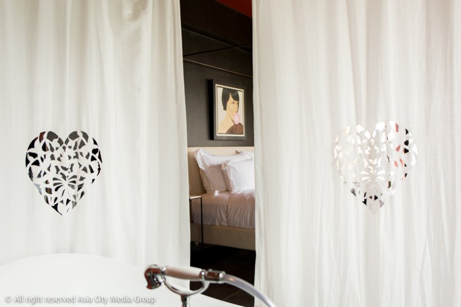 โฮเทลอำแดงมีทั้งสิ้น 4 ชั้น ประกอบไปด้วยห้องพักที่ให้ความเป็นส่วนตัวมาก ๆ เพราะมีเพียง 10 ห้องเท่านั้น ประกอบไปด้วยห้องดีลักซ์จำนวน 4 ห้อง ห้องริเวอร์ แกรนด์ ดีลักซ์ จำนวน 4 ห้อง และห้องริเวอร์สวีทที่ชั้นบนสุดจำนวน 2 ห้องที่เพดานสูงเป็นพิเศษ โดยทุกห้องจะเลือกใช้เฟอร์นิเจอร์เก่าที่คัดมาจากเชียงใหม่ แม่สอด ไปจนถึงต่างประเทศ (และบางชิ้นก็ทำขึ้นมาใหม่เพื่อให้เหมาะสมกับการใช้งานภายในโรงแรม) มาตกแต่ง ความกรี๊ดของเราพุ่งเป้าไปที่ห้องน้ำที่มีความเช็กซี่และเย้ายวน เหมาะกับการมาพักเป็นคู่ ๆ มาก ๆ เพราะลักษณะของห้องน้ำเป็นแบบเปิดโล่ง มีอ่างอาบน้ำตั้งอยู่โดด ๆ จนแทบจะเป็นส่วนหนึ่งของห้องพัก มีเพียงผ้าม่านสีขาวสะอาดที่ฉลุลายลูกไม้รูปทรงหัวใจให้รูดปิดได้ (ขอบอกว่าไม่ว่าจะพักห้องไหน ก็มีอ่างอาบน้ำแบบนี้ให้ทุกห้อง !) แต่ถ้าใครชอบอาบแบบฝักบัวก็มีให้ใช้งานเหมือนกัน แต่ก็เป็นห้องกระจกนะ คงคอนเซปต์ The Most Romantic Hotel in Bangkok ได้ไวอย่างเหนียวแน่นเลยล่ะ
