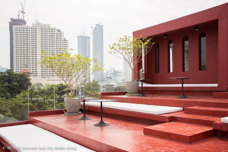 ขึ้นไปบนดาดฟ้าเราถึงกับต้องร้องว้าว เพราะจุดนี้ถือเป็นสปอตที่สามารถชมวิวแม่น้ำเจ้าพระยาได้อย่างดีมาก ๆ แถมเขายังทำเป็นอัฒจันทร์ขั้นบันไดลดลั่นกันไป นั่งชมวิวตรงหน้าอย่างไม่มีใครบังใคร เป็นการจัดสรรพื้นที่ได้อย่างครีเอทและเก๋มาก ๆ นอกจากนี้ในอนาคตที่นี่ยังจะเป็น Rooftop Bar ที่ให้เราจิบเครื่องดื่มแก้วโปรดไป นั่งชมวิวยามค่ำคืนของเจ้าพระยาและกรุงเทพฯ ไป ส่วนอีกฝั่งของบาร์บนดาดฟ้าอาจเป็นโซนนวดแผนไทยสำหรับแขกผู้เข้าพัก ตอนนี้โครงสร้างบาร์เหล็กดัดทรงเจดีย์ก็เริ่มสร้างใกล้เสร็จแล้ว คิดว่าอีกไม่นานคงได้เปิดให้บริการแน่นอน
