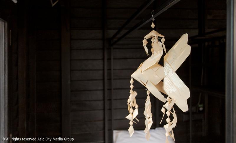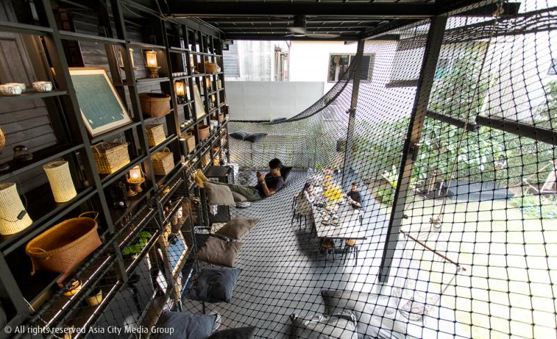 มองไปข้างบนจะเห็นตาข่ายให้นอนแฮงเอาท์กันแบบไม่ต้องกลัวขาดเลย เพราะเป็นตาข่ายเฮลิคอปเตอร์ ที่ 1 ปมตาข่าย รับน้ำหนักได้ถึง 80 โลแหนะ และรอบ ๆ ยังมีการตกแต่งด้วยเครื่องใช้แบบไทย ๆ ไม่ว่าจะเป็นตะกร้าสาน ขัน โคมไฟ ที่สามารถเอาไปเป็นพรอปถ่ายรูปได้ด้วยนะ