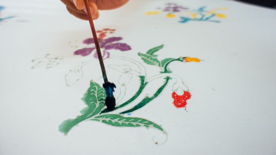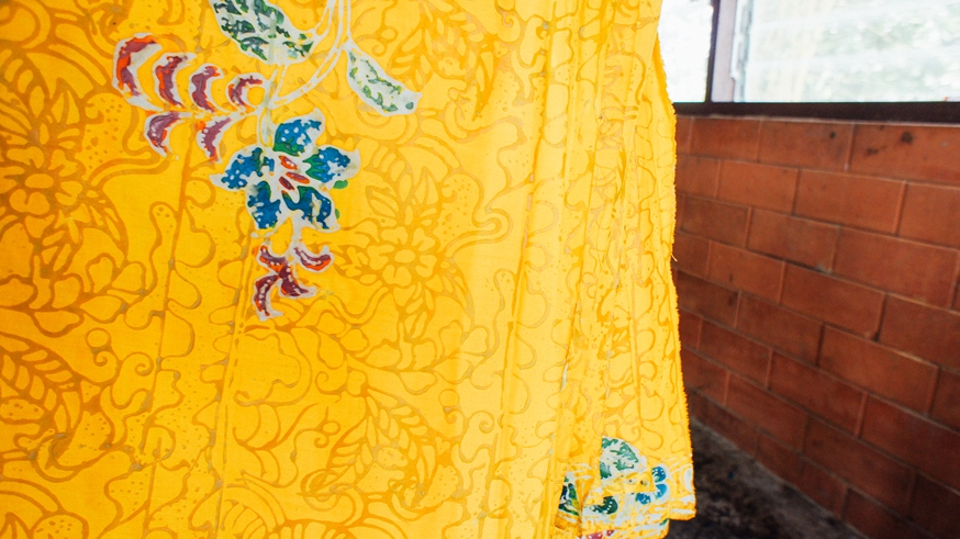 เราเห็นคุณป้าผู้หญิงคนนึงนั่งยิ้มอยู่ตอนที่พี่ๆ กำลังอธิบายเรื่องผ้าปาเต๊ะ ก่อนที่จะเรียนรู้ว่าป้าประจิมคนนี้เนี่ยแหละที่เป็นคนริเริ่มนำการเขียนผ้าที่เป็นเอกลักษณ์นี้มาทำที่ชุมชน เดิมทีมีที่มาจากประเทศอินโดนีเซีย จนถึงปัจจุบันนี้ผ้าปาเต๊ะยังสามารถนำไปตัดเย็บต่อเป็นชุดสำเร็จรูปใส่ หรือจะนำไปตกแต่งบ้านก็ได้นะ