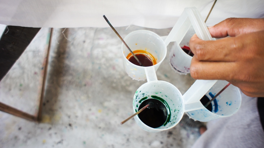 ตัวผ้าต้องผ่านการย้อมสีจนกว่าจะออกมาเป็นสิ่งที่เราต้องการ ช่วงนี้งานเวิร์กช็อปงานคราฟต์กำลังฮิตมากในกรุงเทพฯ เราเดินดูสถานที่บริเวณรอบๆ แล้วทำให้นึกถึงกิจกรรมย้อมครามมากเลย เพียงแต่สำหรับคนที่นี่ มันคืองานฝีมือที่ส่งทอดต่อกันมาหลายรุ่น