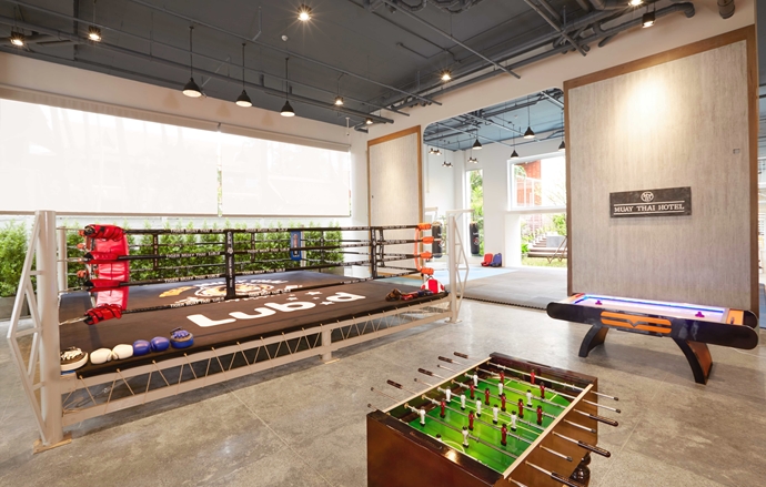 ส่วนข้างล่างของโรงแรมคงต้องบอกว่าน่าจะเป็นไฮไลท์ที่ทำให้ Lub d โดดเด่นกว่าโรงแรมไหนๆ ในภูเก็ตเลยก็ว่าได้ เริ่มตั้งแต่ก้าวเท้าเข้ามาในล็อบบี้ ก็จะได้รับการต้อนรับด้วยเวทีมวยขนาดยักษ์ที่ทางโรงแรมตั้งใจเอาไว้ให้แขกที่เข้าพักได้มาเข้าคอร์สฝึกแตะมวยไทยกับโค้ช หรือให้ขึ้นไปถ่ายรูปเล่นๆ ได้ตอนที่ไม่มีการซ้อม โดยข้างๆ กันก็มีโต๊ะเกมส์ไว้ให้เล่นกันสนุกๆ ได้