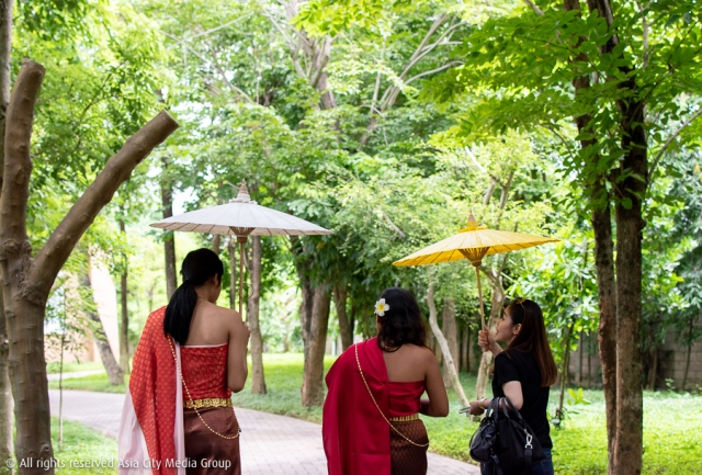 ส่วนใครที่ชอบฟีลลิ่งแบบย้อนยุคจัดเต็ม ที่นี่ก็มีให้เช่าชุดไทยสำหรับทั้งสุภาพบุรุษ สุภาพสตรี และเด็ก ราคาเริ่มต้นที่ 200-450 บาท ซึ่งสามารถใส่เดินเล่นได้ในทุกโซนของอุทยานแห่งนี้ และจะยิ่งฟินมาก ๆ ถ้าได้ใส่ถ่ายรูปในโซน สัทธาถิ่นเรือนไทย ที่จำลองเอาบ้านทรงไทยโบราณจากทั้ง 4 ภาคมาไว้ภายในบริเวณนี้ด้วย