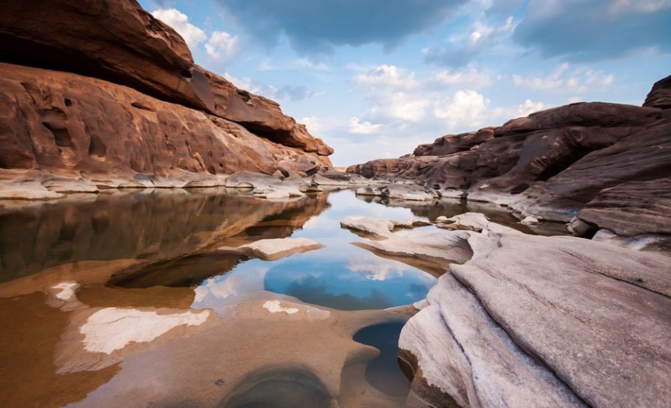 หน้าแล้งน้ำน้อยอย่างนี้ต้องไป สามพันโบก เพราะแก่งหินที่ซ่อนตัวอยู่ใต้ลำน้ำโขงนี้จะเผยโฉมออกมาให้เราเห็นเฉพาะตอนน้ำลงเท่านั้น ประติมากรรมธรรมชาติอันสวยงามนี้เกิดจากการกัดเซาะของกระแสน้ำจนเกิดเป็นภูเขาหินที่มีหลุมรูจำนวนนับพัน เป็นที่มาของชื่อสามพันโบก เพราะโบกแปลว่าหลุมในภาษาอีสานนั่นเอง