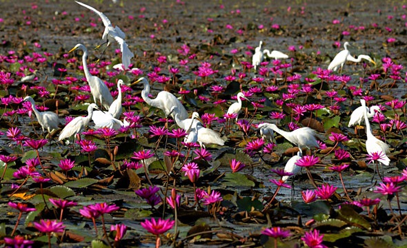 เดือนเมษายนเหมาะจะไปเที่ยวที่นี่มากๆ เพราะเป็นช่วงที่บัวแดงจะบานจนเต็มทะเลสาบเลย แต่ถ้าอยากดูต้องยอมตื่นเช้าเท่านั้น เพราะถ้าไปสายดอกบัวจะหุบหมดแล้ว นอกจากดอกบัวที่นี่ก็มีนกน้ำให้ดูหลากหลายสายพันธุ์ รวมไปถึงควายน้ำ ซึ่งก็เป็นควายบ้านธรรมดานี่แหละ แต่เพราะว่าอาศัยอยู่แถบนี้ จึงลงไปลุยน้ำแช่น้ำสบายใจ