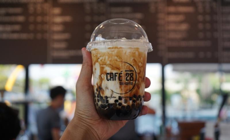 ปิดท้ายทริปนี้ด้วยคาเฟ่สักที่ และ แม้ Cafe' 28 Specialty Tea & Coffee นั้นจะเป็นร้านที่ตั้งอยู่ที่ชั้นล็อบบี้ของโรงแรม The 28th Hotel ที่ตั้งอยู่ตรงข้ามกับศูนย์การค้าโรบินสัน กาญจนบุรี แต่ก็ต้องบอกว่ามีลูดค้าแวะเวียนเดินเข้า-ออกมาซื้อเครื่องดื่มที่นี่กันอย่างไม่ขาดสาย เพราะที่นี่เขามีเครื่องดื่มให้เลือกหลากหลาย ทั้งกาแฟ และเครื่องดื่มแบบ Non-Coffee อย่างช็อคโกแลต ชาเขียว หรือกลุ่มชานมไข่มุกที่ทางร้านบอกว่าเป็นสูตรไต้หวันแท้ ๆ เราลองสั่งนมสดไข่มุกบราวน์ชูก้า (65 บาท) มาลองชิมว่าไข่มุกบราวน์ชูก้าจะอร่อยจริงไหม และก็จริงอย่างที่ทางร้านเคลม เพราะตัวไข่มุกหอมน้ำตาลทรายแดงมาก มาใน 2 สีคือไข่มุกสีดำเม็ดเล็ก และไข่มุกสีทองเม็ดใหญ่ ตัวไข่มุกอาจหวานไปหน่อย แต่ถ้ากินพร้อมนมสดรสจืดก็กำลังไปได้สวย