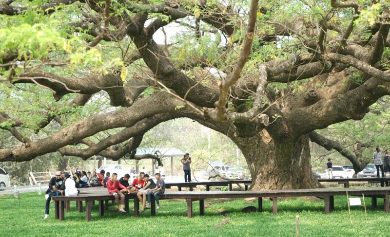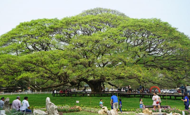 เที่ยววัดแล้วก็ขับรถมาต่อกันที่ธรรมชาติสวย ๆ ในตัวเมืองอีกสักที่ดีกว่า กับต้นจามจุรียักษ์ที่ยักษ์จริง ๆ ไม่โม้ การเดินทางก็ง่าย ๆ เพียงขับรถมายังกองการสัตว์และเกษตรกรรมที่ 1 กรมการสัตว์ทหารบก (ซึ่งจริง ๆ แล้วตรงนี้ก็ตื่นตาเหมือนกัน เพราะจะเจอมาวิ่งอยู่ในรั้วเยอะแยะไปหมด ให้อารมณ์เหมือนตัวเองกำลังอยู่เท็กซัสชอบกล) และตรงมาตามป้ายบอกทางเรื่อย ๆ นิดเดียวก็ถึงแล้ว ทีแรกที่เราเห็นภาพต้นจามจุรีนี้ก็ตั้งใจว่าจะต้องมาเห็นของจริงให้ได้ แต่เมื่อมาถึงก็ผิดคาดนิดหน่อยเพราะความนิยมของสถานที่นี้ที่เพิ่งสูงขึ้นเรื่อย ๆ ทำให้ทางการต้องเข้ามาจัดระเบียบเสียใหม่ เดิมที่เคยเป็นแค่พื้นที่โล่งกว้างปกติ มีเพียงไม่ใหญ่อายุกว่าร้อยปีต้นนี้ตระหง่านอยู่ ตอนนี้มีทั้งสะพานเดินชมรอบต้นไม้ ซุ้มถ่ายรูป ร้านค้าตั้งเรียงราย เสน่ห์เลยอาจขาดหายไปบ้าง แต่ความใหญ่โตของมันก็ยังทำให้เราร้อวว้าวได้อยู่ ว่ากันว่าจามจุรีต้นนี้ลำต้นว้าง 10 คนโอบ เส้นผ่าศูนย์กลางร่มเงากว้างกว่า 51 เมตร รวมพื้นที่ทั้งหมดของพุ่มไม้คือกว่ากว่า 1 ไร่เลยนะ โอ้โห